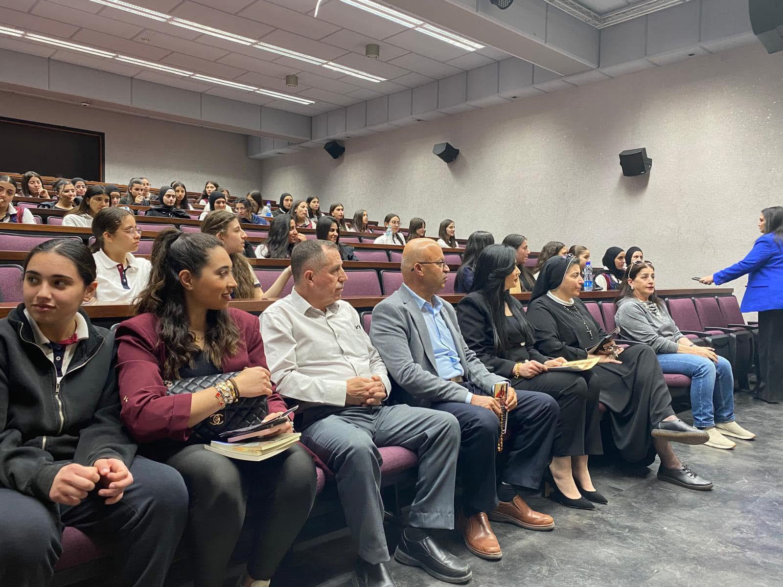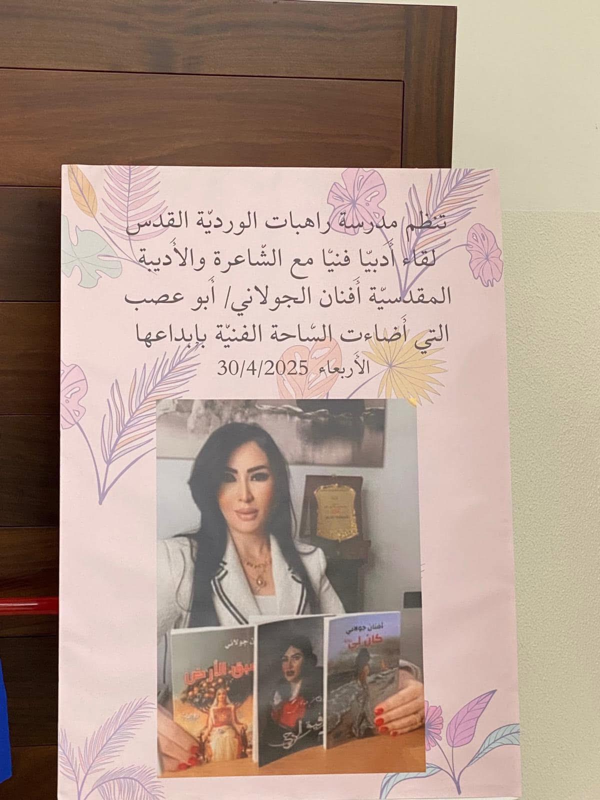 نظّمت مدرسة راهبات الوردية في القدس، يوما أدبيا تكريميا احتفاءً بالأديبة الشاعرة المقدسية أفنان جولاني، ضمن فعاليات ثقافية تمحورت حول أعمالها الأدبية والشعرية، بمشاركة طالبات ومعلمات المرحلة الثانوية.واستُهلت الفعاليات باستقبال الأديبة من قبل إدارة المدرسة وكادر اللغة العربية، حيث عُرضت جدارية ولوحات تعبيرية أعدتها طالبات الصف الحادي عشر، مستوحاة من روايتها الأخيرة "عبق الأرض" ومؤلفاتها الأخرى. وألقت المعلمة ناريمان أبو فرحة كلمة ترحيبية بالضيفة، سلطت فيها الضوء على مسيرتها الأدبية الإبداعية، تلاها عزف النشيد الرسمي للرابطة العالمية للدفاع عن اللغة العربية. وأشادت مديرة المدرسة، الأستاذة لوسي جاد الله، بإسهامات الأديبة الجولاني في الساحة الأدبية، وبما تقدّمه من أعمال تحمل رسائل وطنية وإنسانية عميقة، مؤكدة اعتزاز المدرسة باستضافتها. وقدمت لها درعا تكريميا تقديرا لمسيرتها الأدبية. ووصفت جاد الله المناسبة بأنها احتفاء بالقدس وهويتها الثقافية من خلال تكريم صوت أدبي نسوي مشرف. وقدمت للأديبة درعا تكريميا تقديرا لمسيرتها الأدبية. وبدورها، أثنت الأديبة الجولاني على الجهد الذي تبذله مديرة المدرسة الأستاذة لوسي، ووصفتها بأنها قيادية تربوية ملهِمة، تمتلك رؤية ثقافية وإنسانية، وتحرص على ترسيخ القيم الجمالية والفكرية في نفوس الطالبات. وعبّرت عن امتنانها العميق للمدرسة، ومعلماتها، وطالباتها، مشيدة بالمستوى الثقافي والفني والإبداعي للفعاليات، لافتة إلى أن توجيهات المديرة ساهمت في إحداث نقلة نوعية في مسيرة المدرسة من خلال النهوض بمستوى التعليم، وتعزيز روح العمل الجماعي بين الهيئة التدريسية والطالبات، مما نتج عنه بيئة تعليمية مزدهرة ومشجعة على الابتكار والإبداع. واضافت الجولاني أن الأستاذة جاد الله تشكل قدوة في الإلهام والعطاء، لما تتمتع به من رؤية ثاقبة ورعاية شاملة، مشيرة إلى أن المدرسة، بقيادتها، استطاعت تجاوز العديد من التحديات وحققت نجاحات ملموسة، محولة إياها إلى فضاءٍ تربوي نابض بالإبداع، وملاذٍ آمن لطالباتها، يسعين على تحقيق أحلامهن والوصول إلى أعلى المراتب وكما شكرت المدرسة والمعلمة ناريمان أبو فرحة، لمبادرتها وإشرافها الكامل والدقيق على تنظيم الفعالية، وما بذلته من جهد كبير في إخراج هذا اليوم الثقافي بأعلى درجات التميز. وتضمنت الفعالية إلقاء الجولاني قصيدتين من شعرها، ومشاركتها في حوار مفتوح مع الطالبات حول تجربتها في الكتابة، كما أهدت المدرسة لوحة فنية تتضمن مقطعا من قصيدتها "فلسطينية".وقدمت الطالبات مجموعة من المشاركات الأدبية والفنية التي عكست تفاعلهن مع أعمال الأديبة الجولاني، حيث أُلقيت كلمات وقصائد مقتبسة من كتاباتها تناولت موضوعات الوطن، الهوية، والإنسان. كما قدمت عروض مرئية ضمت مشاهد من القدس، ووصلات غنائية مستوحاة من قصائدها، إضافة إلى مشاهد تمثيلية مستلهمة من رواية "عبق الأرض"، وعروض أعمال فنية صممتها الطالبات بأنفسهن حملت اقتباسات ملهمة من نصوص الجولاني، عبرت عن تقديرهن لمسيرتها الأدبية ووقعها الإنساني والثقافي. ووزعت الطالبات على الحضور مطويات تعريفية من تصميمهن، تضمنت نبذة عن حياة الكاتبة وأبرز أعمالها، مثل روايتي "عبق الأرض" و"كان لي"، وديوان "رفيق الروح"، إلى جانب مقتطفات من قصائدها.كما قدمت الخريجة أسيل أبو الهوى لوحة فنية تجسد شخصية الكاتبة، فيما وزعت الطالبات عملا فنياً من الورود الزرقاء يحمل بطاقات مقتبسة من أقوال ملهمة في كتابات الجولاني. وقدّم الأستاذ عيسى بنورة خاطرة شعرية نظمها خصيصاً بالمناسبة، عبّر فيها عن تقديره لمسيرة الجولاني الأدبية. ويُذكر أن الكاتبة أفنان الجولاني هي أديبة وشاعرة من مدينة القدس، تحمل في أعمالها هما وطنيا وإنسانيا، وتركز كتاباتها على قضايا الهوية الفلسطينية. ومثلت دولة فلسطين في عدد من المحافل الأدبية والثقافية العربية والدولية، وتم تصنيفها ضمن قائمة أفضل 100 شخصية متم