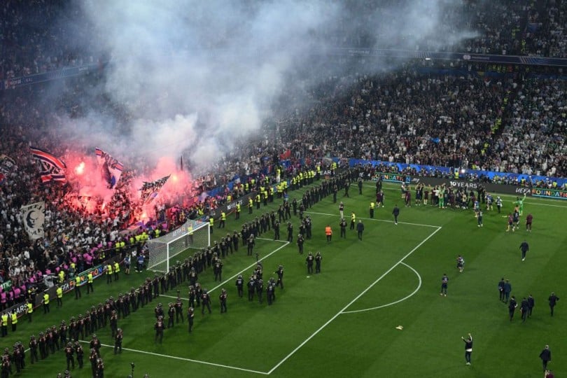 في خطوة تعبر عن دعمهم لفلسطين، رفع جمهور نادي باريس سان جيرمان الفرنسي لافتة طالبوا من خلالها بوقف المجازر التي يتعرض لها قطاع غزة، وذلك خلال مباراة الفريق مع إنترميلان الإيطالي في نهائي بطولة دوري أبطال أوروبا.وخلال المباراة، ظهرت لافتة كبيرة رفعها جمهور باريس سان جيرمان، حملت عبارة «أوقفوا المجازر في غزة».كما تظاهر الآلاف من مشجعي نادي باريس سان جيرمان في شوارع العاصمة الألمانية ميونخ، حيث أقيمت المباراة، رافعين الأعلام الفلسطينية، رفضا للإبادة في غزة، وذلك قبيل المباراة.في السياق، قالت وزارة الداخلية الفرنسية اليوم الأحد إن الشرطة ألقت القبض على أكثر من 500 شخص خلال الاحتفالات بفوز باريس سان جيرمان بلقب دوري أبطال أوروبا لكرة القدم، وأفادت أنباء عن مقتل شخصين وإصابة 192 آخرين.وانطلقت احتفالات صاخبة في جميع أنحاء العاصمة الفرنسية وضواحيها مساء أمس السبت بعد أن سحق سان جيرمان منافسه إنتر ميلان الإيطالي بنتيجة 5-صفر ليحقق أول ألقابه في دوري أبطال أوروبا، لكن المناوشات اللاحقة مع الشرطة كادت تلقي بظلالها على الاحتفالات.