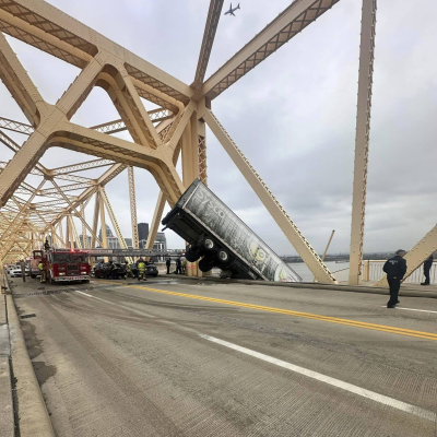نجح رجال الدفاع المدني الأميركي في سحب سائقة شاحنة كانت محتجزة داخل كابينة شاحنتها التي تدلت من فوق جسر على نهر أوهايو.وقال برايان أونيل مدير وحدة الإطفاء في لويسفيل، خلال مؤتمر صحافي يوم الجمعة، إن 3 سيارات اصطدمت ببعضها على جسر جورج روجرز كلارك الذي يربط بين لويسفيل في ولاية كنتاكي وجنوب ولاية إنديانا.وتابع: «نُقل أحد المصابين للمستشفى على الفور، بينما استغرقنا نحو 40 دقيقة لربط الحبال، وتجهيز أحد الأشخاص للنزول، وسحب سائقة الشاحنة من كابينة القيادة».سحب سائقة شاحنة كانت محتجزة داخل كابينة شاحنتها التي تدلت من فوق جسر على نهر أوهايو (أ.ب)وأضاف: «لقد جرت العملية بنجاح بفضل رجال الدفاع المدني المجهزين والمدربين».واستطرد: «إنهم أبطال ومحترفون ومدربون جيداً، ويمارسون عملهم باحترافية».وقال مسؤولون في قطاع النقل في كنتاكي إنه سيجري فحص الجسر بعد رفع الشاحنة التي كسرت السور.