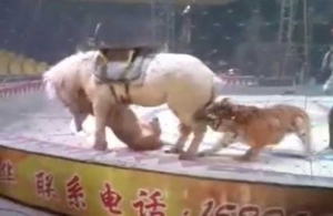 شاهد فيديو..أسد ونمر ينقضان على حصان في عرض سيرك صيني ويحاولان التهامه...