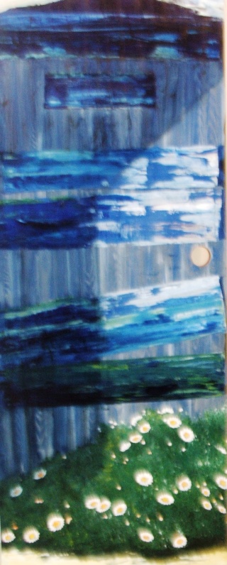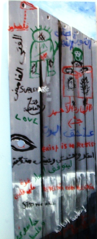 القسم الخامس: كان عبارة عن بوابة خشبية رسم على الواجهة الأولى منها بوابة خشبية مغلقة بالعوارض الخشبية، وتنمو الزهور البيضاء الربيعية في أسفلها، بينما في الواجهة الأخرى رسمت الجدار الذي بناه الاحتلال لتقسيم الوطن، ومرسوم عليه الشعارات الوطنية التي يكتبها أبناء شعبنا في عملية رفض للجدار، ورفض للاحتلال، وفي أسفل الجدار لفت نظري عبارة: الانتفاضة الثالثة، فهل رأت الفنانة أثناء تواجدها في وطننا المحتل أن الجدار ممثلاً للاحتلال هو الذي يحجب العبور من بوابة الزهور؟ بوابة الفرح والوطن الحر، فرأت في الجدار شرارة ستشعل الانتفاضة الثالثة؟!