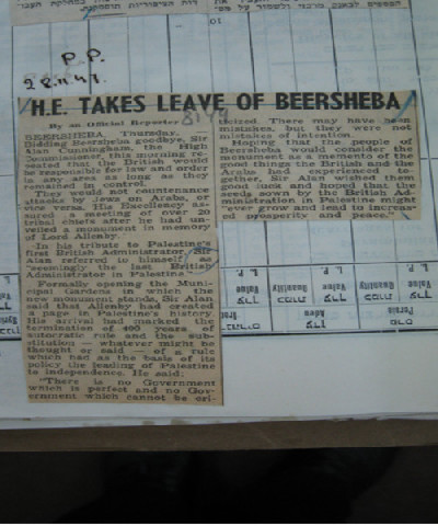 5. قصاصة صحيفه من جريدة فلسطسن بوست تبين خبر اجتماع الانجليز بمشايخ النقب في بئر السبع قبل مغادرتهم البلاد منهين فترة استعمارهم التي دامت ثلاثة عقود. المصدر الارشيف الصهيوني المركزي- القدس).