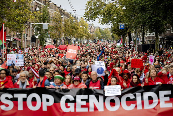 احتشد عشرات آلاف الأشخاص اتّشحوا بالأحمر الأحد في أمستردام للمطالبة بإنهاء الحرب في غزة على وقع هتافات أبرزها "فلسطين حرّة" و"أوقفوا الإبادة الجماعية".وأفاد القيّمون على هذه المبادرة التي أقيمت تحت اسم "خطّ أحمر" بأن نحو 250 ألف شخص شاركوا في التحرّك المنظّم في العاصمة الهولندية، مطالبين حكومة بلدهم باتّخاذ تدابير ضد الاحتلال الإسرائيلي.وقال سيباستيان بوس، وهو فنان في الثامنة والستين أتى من جنوب البلاد "أتوقّع (من الحكومة) أن تفرض عقوبات على إسرائيل وتوقف المبادلات التجارية معها وأن تعترف بدولة فلسطين".وأضاف بوس الذي اعتمر قبّعة حمراء "يخجلني كثيرا ما تفعله الحكومة والموقف الذي تتّخذه".وفي منتصف آب/ أغسطس، فشل البرلمان الهولندي في التوافق على عقوبات جديدة تفرض على إسرائيل على خلفية الحرب في غزة، ما دفع وزير الخارجية كاسبار فيلدكامب إلى تقديم استقالته.وخلافا لبلدان أوروبية أخرى مثل فرنسا وبلجيكا، لم تعترف هولندا بعد بدولة فلسطين.وأكدت سوزان البالغة 33 عاما والتي تعمل في دار نشر أنها تولي أهمّية كبيرة لمسألة غزة خصوصا مع اقتراب موعد الانتخابات في 29 تشرين الأول/أكتوبر.وقالت الشابة التي فضّلت عدم الكشف عن اسمها "آمل أن ننجح في تمرير الرسالة التي تدعو إلى إقران الأقوال بالأفعال".ورغم الأمطار المتقطعة، سار المتظاهرون طوال ساعات رافعين لافتات تدعو إلى اتّخاذ عقوبات ضد إسرائيل.ونظّمت تحرّكات مماثلة في أيّار/مايو وحزيران/يونيو في لاهاي جمعت 100 و150 ألف شخص، بحسب القيّمين على المبادرة.والسبت، خرج مئات آلاف الأشخاص دعما للفلسطينيين في روما وبرشلونة ومدريد. وأقيمت هذه التحرّكات خصوصا بعد اعتراض البحرية الإسرائيلية "أسطول الصمود العالمي" الذي كان يحمل مساعدات إلى غزة.