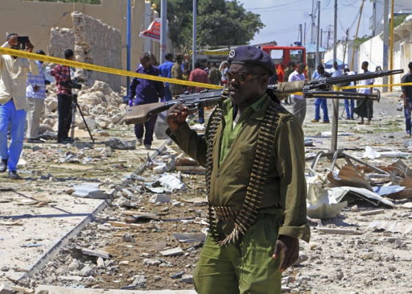 أفادت الشرطة وشهود في الصومال بأن 14 شخصا على الأقل لقوا حتفهم، الاثنين، جراء تفجير انتحاري مزدوج بمركبتين مفخختين استهدف فندقا يحظى بشعبية بين الأجانب من دول الغرب في العاصمة مقديشو .وشملت حصيلة القتلى أربعة أفراد من قوات الأمن، وثمانية مدنيين والانتحاريين الاثنين سائقي المركبتين .وقال مسؤول الشرطة علي حسن كولمي إن قوات الأمن استوقفت سيارة في نقطة تفتيش بالقرب من المطار .وذكرت بعثة الاتحاد الأفريقي في الصومال عبر موقع تويتر أن السيارة انفجرت ودمرت نقطة التفتيش وفتحت الطريق أمام شاحنة كانت تليها، والتي انفجرت أيضا.وصرح كولمي بأن "سائقي السيارتين ... كانا يحاولان دخول "فندق السلام"، الذي يرتاده الأجانب الغربيون ومسؤولو الاتحاد الأفريقي والحكومة الصومالية".وتسبب التفجير في تخريب جزئي للفندق الواقع بالقرب من المطار أيضا.وقال مسؤول الأمن، محمد حسن، إن حصيلة القتلى مرشحة للارتفاع. وأفادت تقارير غير مؤكدة بأن من بين القتلى أفراد حراسة كانوا أمام الفندق. ولم يتضح على الفور ما إذا كان هناك أي قتلى قد سقطوا داخل الفندق.وقال الشاهد عمر عافي إنه رأى ما لا يقل عن 16 مصابا في موقع الهجوم.وتسبب انفجار الشاحنة، الذي كان أقوى من الانفجار الأول، في تصاعد كم كبير من الأدخنة في سماء المدينة.ووقع إطلاق نار أيضا عقب التفجير المزدوج الذي أعلنت جماعة "الشباب" الإسلامية المتطرفة مسؤوليتها عنه عبر موقع "أندلس" التابع للجماعة.وكانت تقارير غير مؤكدة قد ذكرت أن الهجوم استهدف قاعدة عسكرية للاتحاد الأفريقي، والتي تقع أيضا بالقرب من المطار. ولكن جماعة الشباب قالت إنها استهدفت الفندق.يذكر أن الاتحاد الأفريقي ينشر أكثر من 20 ألف جندي في الصومال لمساعدة الحكومة في قتال جماعة "الشباب"، والتي أودت عملياتها المسلحة والإرهابية بحياة الآلاف خلال العقد الماضي.!!