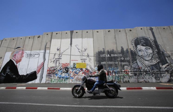 غرافيتي لـ”بناكسي” يظهر ترامب وهو يعانق الجدارالعازل للإحتلال بالضفة!!...