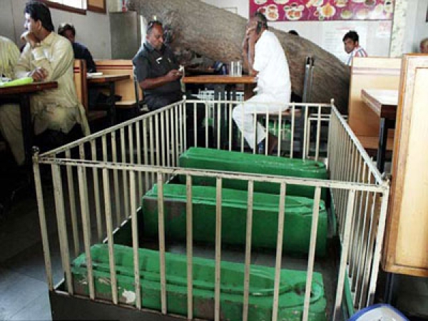 توابيت حول الطاولات في مطعم بموقع مقبرة قديمة في الهند!!...
