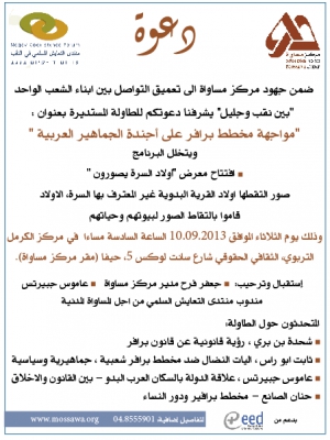 ضمن جهود مركز مساواة الى تعميق التواصل بين ابناء الشعب الواحد "بين نقب وجليل" يشرفنا دعوتكم للطاولة المستديرة بعنوان :"مواجهة مخطط برافر على أجندة الجماهير العربية "ويتخلل البرنامج افتتاح معرض "أولاد السرة يصورون " وهو عباره عن صور التقطها اولاد القرية البدوية غير المعترف بها السرة، الاولاد قاموا بالتقاط الصور لبيوتهم وحياتهم وذلك يوم الثلاثاء الموافق 10.09.2013 الساعة السادسة مساءا في مركز الكرمل التربوي، الثقافي الحقوقي شارع سانت لوكس 5، حيفا (مقر مركز مساواة).إستقبال وترحيب: جعفر فرح مدير مركز مساواة .عاموس جبيرتس مندوب منتدى التعايش السلمي من اجل المساواة المدنية .المتحدثون حول الطاولة: شحدة بن بري , رؤية قانونية عن قانون برافر .ثابت ابو راس ، اليات النضال ضد مخطط برافر شعبية ، جماهيرية وسياسية .عاموس جبيرتس ، علاقة الدولة بالسكان العرب البدو – بين القانون والاخلاق. حنان الصانع ، مخطط برافير ودور النساء في التصدي له وتأثيراته على المرأه العربية البدوية..لتفاصيل إضافية:04.8555901 !!