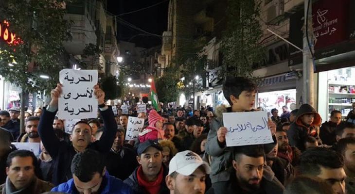 انطلقت وسط مدينة رام الله مسيرة جماهيرية حاشدة، مساء الخميس ، دعماً وإسناداً للأسرى، سيّما المضربين عن الطعام، لرفض اعتقالهم الإداري، والتنديد بالجريمة بحق الأسير سامر العربيد، الذي تعرض للتعذيب أثناء التحقيق معه ونقل إثر ذلك إلى المستشفى، مشيدين بصمود الأسرى، على رغم ما يتعرضون له من تعذيب ومعاملة غير إنسانية.وكان في مقدمة المسيرة أهالي الأسرى وممثلو القوى الوطنية والإسلامية، إلى جانب عشرات المواطنين، رافعين العلم الفلسطيني وصور الأسرى المضربين عن الطعام والأسير العربيد، كما رفعوا شعارات تُطالب بإسناد الأسرى ونصرتهم، وبتحمل المجتمع الدولي مسؤوليته تجاه أبناء الشعب الفلسطيني.