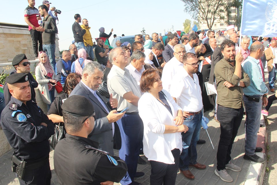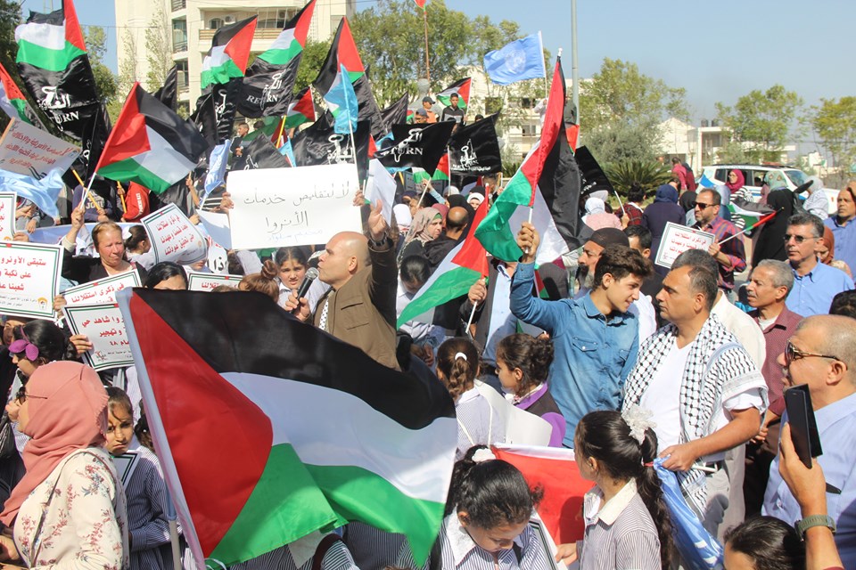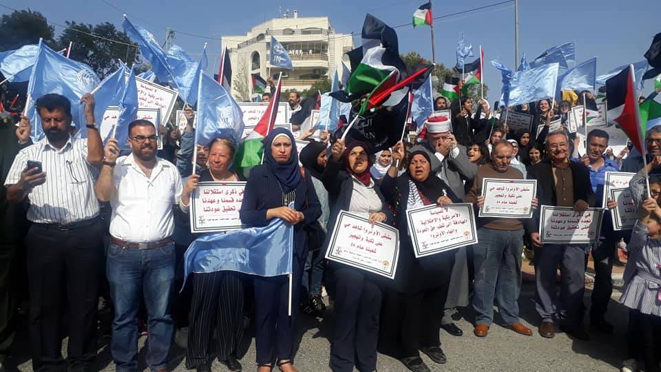 ندد الاف المشاركون خلال الوقفة الاحتجاجية التي نظمتها دائرة شؤون اللاجئين بمنظمة التحرير الفلسطينية واللجان الشعبية في مخيمات الضفة الغربية اليوم امام مقر الامم المتحدة بمدينة رام الله بسياسات الإدارة الاميركية المعادية تجاه اللاجئين ووكالة الغوث الدولية " الأونروا" . و عبر المشاركون عن رفضهم لمساعي الإدارة الأميركية والحكومة الاسرائيلية تمرير مخططها لإنهاء عمل الأونروا، وإلغاء تفويضها والمحاولات الرامية لإنهاء قضية اللاجئين وشطب حق العودة.ورفع المشاركون خلال الوقفة الاحتجاجية الاعلام الفلسطينية واعلام الأونروا والشعارات المنددة بسياسة امريكا التصفوية للحقوق والثوابت الفلسطينية والداعمة لتجديد تفويض ولاية عمل الاونروا.وشارك في الوقفة الاحتجاجية جماهير حاشدة وممثلين عن الفصائل والقوى الوطنية واللجان الشعبية للمخيمات والمكتب التنفيذي وشخصيات وطنية واجتماعية ووجهاء ومخاتير واكاديميين .واكد المشاركون على استمرار عمل الاونروا في تقديم خدماتها للاجئين الفلسطينيين وفق التفويض الممنوح لها بالقرار 302 لحين عودة اللاجئين الفلسطينيين الى ديارهم التي هجروا منها عام 1948 طبقا لما ورد في القرار 194 . وطالب المشاركون الدول الاعضاء في الأمم المتحدة على التصويت لصالح تجديد تفويض ولاية عمل الاونروا لثلاث سنوات جدد وفي ختام الوقفة التضامنية تم تسليم مذكرة باسم دائرة شؤون اللاجئين بمنظمة التحرير الفلسطينية ولجانها الشعبية في مخيمات الضفة الغربية لممثل الامين العام للأمم المتحدة انطوني غوتريش في مدينة رام الله بحضور عدد من الفعاليات والشخصيات الوطنية وعضو اللجنة المركزية لحركة فتح دلال سلامة ومدير عام دائرة شؤون اللاجئين في المنظمة وكادر دائرة شؤون ورؤساء اللجان الشعبية ورئيس المكتب التنفيذي والقوى الوطنية . وقد أكدت المذكرة الى اهمية دعم الأونروا مالياً وسياسياً ومساهمة الدول الاعضاء في الامم المتحدة والمانحين بتمويل اضافي جديد لميزانيتها الاعتيادية سيحقق الاستقرار المالي في موازنتها وقطع الطريق امام مخططات تصفيتها ، وسيضمن استمرار خدماتها وعمل برامجها ومؤسساتها ومدارسها وعياداتها الصحية التي تخدم 6.2 مليون لاجئ فلسطيني .وطالبت المذكرة الأمين العام للأمم المتحدة السيد انطونيو غوتريش والدول الأعضاء في الأمم المتحدة التصويت لصالح تجديد ولاية عمل الأونروا حسب التفويض الممنوح لها بالقرار 302 ، التزاماً امام مسؤولياتها وحفاظاً وحماية لدورها الحيوي باعتبارها الجهة الدولية الوحيدة المعنية بإغاثة وتشغيل اللاجئين الفلسطينيين .واكدت المذكرة الى ان تجديد تفويض عمل الأونروا أمر ضروري الى حين عودة اللاجئين الفلسطينيين إلى ديارهم التي هجروا منها عام 1948 طبقا لما ورد في القرار 194.واشارت الى إن المرجعية القانونية والسياسية التي تحدد عمل ومهام وكالة الغوث هي قرارات الامم المتحدة وبخاصة قرار انشائها رقم (302) لعام 1949 التي تحدد ولايتها ومصير عملها ، وليست الادارة الامريكية واسرائيل.واكد مدير عام دائرة شؤون اللاجئين احمد حنون على ان هذه الفعالية تأتي في اطار خطة التحرك لدائرة شؤون اللاجئين التي تم المصادقة عليها من قبل السيد الرئيس محمود عباس واللجة التنفيذية لمنظمة التحرير الفلسطينية لدعم تجديد تفويض ولاية عمل الأونروا حسب لتفويض الممنوح لها بالقرار 302 . ولفت الى ان الوقفات الاحتجاجية الشعبية ضد السياسية الأمريكية والتضامنية في ذات الوقت مع الاونروا تأتي في اطار الدعم الشعبي للدبلوماسية الفلسطينية الي تعمل على مدار الساعة في اروقة الامم المتحدة لحشد الدعم السياسي للأونروا لضمان التصويت لصالح قرار تجديد تفويضها بأغلبية ساحقة .واشار الى ان الدبلوماسية الفلسطينية تواجه تحركا امريكيا - اسرائيليا ضخما لكن نحن مؤمنين بان عدالة القضية الفلسطينية وبدعم من كل احرار العالم واصدقاء الشعب الفلسطيني سوف تنتصر وان المساعي الامريكية الاسرائيلية ستفشل من تمرير مخط