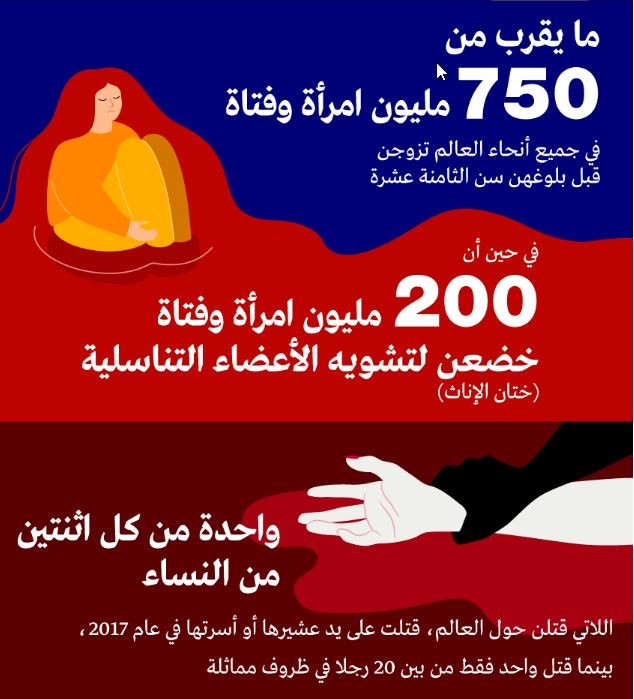 يحيي العالم، اليوم الإثنين25.11.019، بـ"اليوم العالمي للقضاء على العنف ضد المرأة"، والذي أقرّت الجمعيّة العامّة للأمم المتحدة بأنّه، "أحد أكثر انتهاكات حقوق الإنسان انتشارًا واستمرارًا وتدميرًا في عالمنا اليوم".ولفتت الجمعيّة إلى أنّ معظم هذه الانتهاكات لا تزال دون عقاب، لأنّ الضحايا "لا يبلّغن بما وقع لهن خشية من وصمة العار والفضيحة". وحددت الأمم المتحدة، يوم 25 تشرين الثاني/ نوفمبر، يومًا دوليًا للقضاء على العنف ضد النساء في العالم، ويأتي هذا العام تحت شعار "جيل المساواة يقف ضد الاغتصاب" بالتزامن مع إطلاق حملة 16 يومًا لمناهضة العنف. (وتبدأ حملة الـ16 يومًا مثل كل عام، اليوم الإثنين، وتستمر حتى يوم 10 كانون الأول/ ديسمبر المقبل، الذي يصادف اليوم العالمي لحقوق الإنسان. وقالت المنظمة الدولية، في بيان، "إنّ العنف ضد النساء والفتيات هو أحد أكثر انتهاكات حقوق الإنسان انتشارًا واستمرارًا وتدميرًا في عالمنا اليوم، ولكن لا يزال معظمه غير مبلغ عنه بسبب انعدام العقاب والصمت والإحساس بالفضيحة ووصمة العار المحيطة به".وأدرجت الأمم المتحدة في قائمتها عدة أشكال من العنف الممارس ضد النساء، أبرزها؛ الضرب، والإساءة النفسية، والاغتصاب الزوجي، وقتل النساء.وأوضحت الجمعية العامة، أنّ العنف الممارس ضد النساء، يشمل أيضًا؛ الاعتداء الجنسي على الأطفال، والزواج القسري، والتحرش في الشوارع، والمضايقة الإلكترونية، والاتجار بالبشر، والعبودية والاستغلال الجنسي.!!