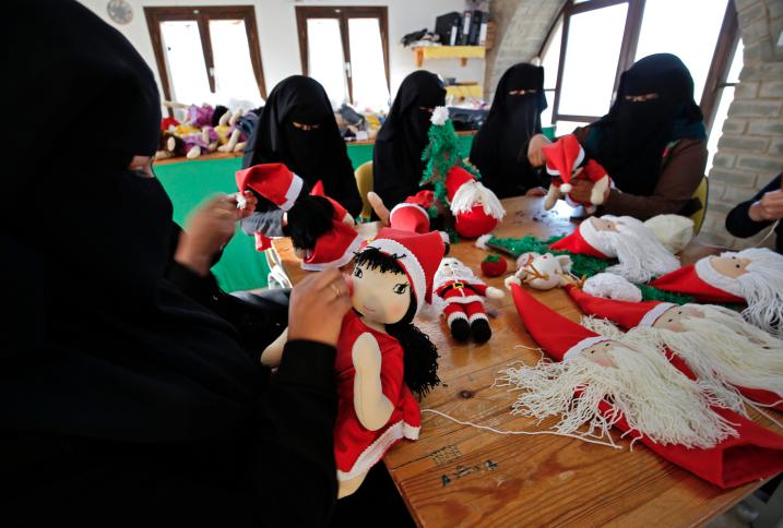 تعكف شابات فلسطينيات في قرية "أم النصر" القريبة من معبر بيت حانون "إيريز" شمال قطاع غزة على صنع هدايا عيد الميلاد في مشغل هو الوحيد في القرية.واعدت عشرون شابة في جمعية زينة التعاونية، وجميعهن منقبات، نحو 200 هدية، منها عرائس القماش ونماذج بابا نويل وشجرة عيد الميلاد المصنوعة من خشب الزيتون، لتباع للأجانب والسكان المحليين.