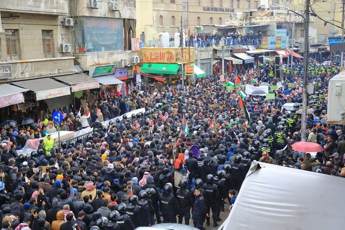 رغم الأمطار الغزيرة، شارك آلاف الأردنيين اليوم، الجمعة، بمسيرة حاشدة، وسط العاصمة، عمان، ضد " صفقة القرن" المزعومة.وردد المشاركون هتافات منددة بالصفقة، من قبيل : "شعب الأردن وفلسطين.. شعب واحد مش (ليس) شعبين" و "بالروح بالدم نفديك يا أقصى" و "ترامب يا جبان..هذه الصيحة من عمان" ويا منزل الأمطار تدحر صهيون الغدار" و "القدس تنادي عمان.. مين هم الأمريكان".كما رفعوا لافتات كتب عليها: "القدس أمانة.. أشعلها ثورة" و "لن ننحني لن ننهزم الأقصى لنا" و "نرفض التطبيع بكل أشكاله"، وغيرها من العبارات الأخرى، وقاموا بحرق العلمين الأميركي والإسرائيلي. وشارك في الفعالية العديد من القيادات الإخوانية في الأردن، تقدمهم المراقب العام للجماعة عبد الحميد الذنيبات، وعلي أبو السكر، وعضو كتلة الإصلاح النيابية (يقودها الإسلاميون) سعود أبو محفوظ، وغيرهم من القيادات الأخرى.وطالب الذنيبات في كلمة له باتخاذ موقف واضح وصريح لوقف "المؤامرة الأميركية" التي تحاك للشعبين الأردني والفلسطيني، محذراً من خطورتها على القضية الفلسطينية.وشهدت معظم محافظات المملكة، فعاليات رافضة للصفقة المزعومة، ومؤكدة على حقوق الشعب الفلسطيني في نيل حقوقه المشروعة.والثلاثاء، أعلن الرئيس الأميركي، دونالد ترامب، في مؤتمر صحفي بواشنطن "صفقة القرن" المزعومة، بحضور رئيس الوزراء الإسرائيلي المنتهية ولايته، بنيامين نتنياهو.وتتضمن الخطة التي رفضتها السلطة الفلسطينية وكافة فصائل المقاومة، إقامة دولة فلسطينية "متصلة" في صورة أرخبيل تربطه جسور وأنفاق، وجعل مدينة القدس عاصمة غير مقسمة لإسرائيل.!!