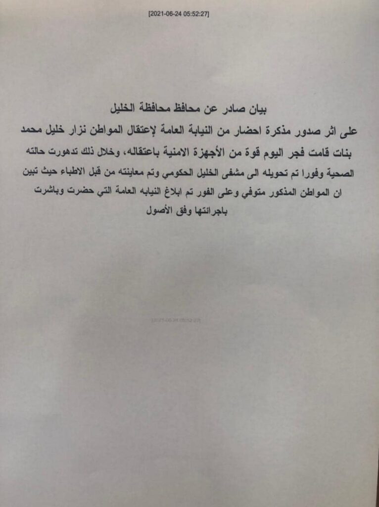 اعلن محافظ الخليل جبرين البكري فجر اليوم عن وفاة الناشط السياسي والحقوقي الفلسطيني نزار بنات خلال اعتقاله من قبل أجهزة الامن الفلسطينية .وقال المحافظ في بيان صحفي” على اثر مذكرة احضار من النيابة العامة لاعتقال المواطن نزار خليل محمد بنات قامت فجر اليوم قوة من الاجهزة الامنية باعتقاله، وخلال ذلك تدهورت حالته الصحية وفورًا تم تحويله الى مشفى الخليل الحكومي وتم معاينته من قبل الاطباء حيث تبين ان المواطن المذكور متوفى. وعلى الفور تم ابلاغ النيابة العامة التي حضرت وباشرت بإجراءاتها وفق الاصول”.وقالت الهيئة المستقلة لحقوق الإنسان “ديوان المظالم” إنها تنظر بخطورة بالغة لحادثة وفاة الناشط نزار بنات المرشح السابق عن قائمة الحرية والكرامة لانتخابات المجلس التشريعي (44 عامًا) والذي أعلن خبر وفاته بعد وقت قصير من اعتقاله من قبل قوة أمنية كبيرة عند الساعة الثالثة فجر اليوم الموافق 24 حزيران الجاري في المنطقة الجنوبية من الخليل.وحسب إفادات شهود عيان وأفراد من العائلة كانوا مع المرحوم، فقد تم الاعتداء عليه بالضرب والرش بالغاز أثناء اعتقاله، وفقًا لبيان الهيئة.وأضافت أنها باشرت الهيئة بالتحقيق وجمع المعلومات حول حادثة الوفاة وستشارك في تشريح الجثمان من خلال طبيب شرعي منتدب من قبل الهيئة، وستعلن نتائج التحقيق التي تتوصل إليها فورًا.وتتهم عائلة بنات الأجهزة الأمنية الفلسطينية باغتيال ابنها نزار، إذ قال ابن عمه عمار، إن قوة من الأجهزة الأمنية فجرت باب البيت الذي تواجد فيه نزار، واقتحمته دون احترام لحرمته، وأشار إلى أن عناصر الأمن انهالوا على رأس نزار بالضرب بالهراوات فور استيقاظه، كما جرى رشّ غاز الفلفل على وجهه، ونقلوه إلى سيارة الاعتقال، بينما كان ينزف.