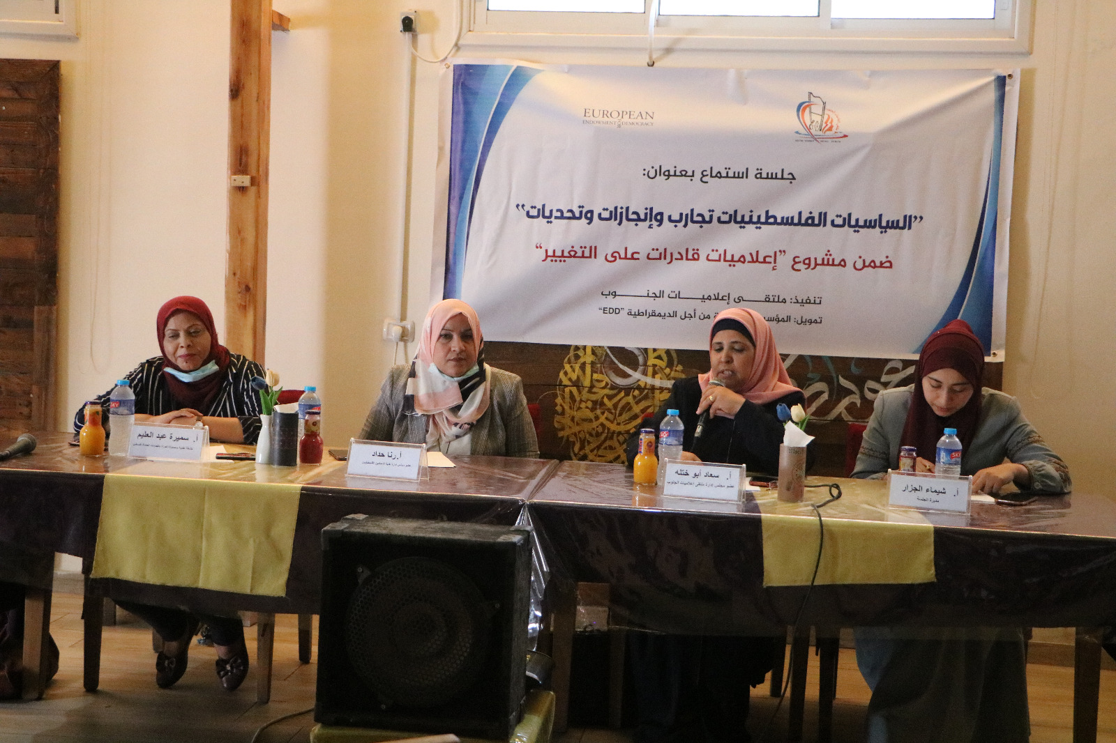 عقد ملتقى إعلاميات الجنوب ثلاث جلسات استماع لنساء سياسيات ونقابيات بعنوان: "السياسيات الفلسطينيات تجارب وإنجازات وتحديات" تطرقن خلالها لواقع مشاركة المرأة السياسية وما حققنه من إنجازات، والاخفاقات والتحديات التي تواجه المرأة وأسباب ضعف مشاركة المرأة في صنع القرار وكيفية دمج الأجبال الجديدة في العمل السياسي والنقابي، بحضور شخصيات اعتبارية واعلامية وشخصيات من القوى الوطنية والاسلامية ودائرة اللاجئين، يأتي ذلك ضمن "مشروع إعلاميات قادرات على التغيير الممول من المؤسسة الاوربية لأجل الديمقراطية EED".وأشادت ليلى المدلل المديرة التنفيذية لملتقى إعلاميات الجنوب بدور المرأة الفلسطينية وما قدمته من أعمال لا تحتاج الى شهادة فهي في قلب المواجهة فما تظهره الفضائيات للمشاهد وما ينشر يوميا في الصحف العربية والعالمية يؤكد دورها الحقيقي وحجم التضحيات التي تقدمها، وخير شاهد ما تقدمه النساء المقدسيات والمرابطات من تضحيات دفاعاً عن القدس في وقتنا الحاضر، ونوهت بان المجال السياسي يعتبر الاهم بسبب ارتباطه بالأبعاد الأخرى التعليمية، والصحية، والاقتصادية.بدورها تناولت أ. فوزية جودة عضوة المكتب السياسي في الجبهة العربية الفلسطينية وعضوة الاتحاد العام للمرأة الفلسطينية التاريخ النضالي للمرأة الفلسطينية منذ نشأت القضية الفلسطينية، وأفادت أن المرأة الفلسطينية مازالت تعاني من مشاكل حرية العمل وسلطة الرجل وقيود العادات والتقاليد، ويعود ضعف التمثيل النسوي في الانتخابات الى طبيعة النظام وسادة التوجهات السياسية والسيادة الذكورية في المجتمع الفلسطيني.كما وتناولت أ. نهى البحيصي مسؤولة لجان المرأة في حركة فتح وعضو الاتحاد العام للمرأة تجربتها السياسية وما حققته المرأة من مكاسب على الرغم من المعوقات والصعوبات التي تحول دون مشاركة حقيقية للنساء وضعف مشاركتها بصنع القرار سواء باللجنة التنفيذية أو على صعيد الاحزاب السياسية. وتطرقت لدور الأعلام وأهميته في ابراز دور المرأة السياسي وما تقدمه من انجازات وعطاء والمطالبة بحقها في المشاركة السياسية والاجتماعية وشغل المناصب العامة وصنع القرار، لتثبيتها على الساحة وتمكينها من الوصول لأماكن صنع القرار. وطالبت الاعلاميات بالمزيد من الاهتمام في تناول قضايا المرأة وانجازاتها السياسية وحقها بتولي المناصب العليا وصنع القرار السياسي.في الجلسة الثانية استضافت ملتقى اعلاميات الجنوب سياسيات من الاحزاب السياسية الاسلامية ونوهت سعاد أبو ختلة عضو مجلس ادارة ملتقى اعلاميات الجنوب بان المرأة تعتبر الجسر الذي يجمع الكل الفلسطيني وأن الهدف من الاستضافة هو تناقل الافكار والخبرات بين القياديات والفئات الشابة من الاعلاميات والخريجات واعلاء صوت النساء وتثبيت لحقوقهن.كما وأثنت هدى حمد مديرة التوجيه السياسي والمعنوية في حركة حماس برفح على دعوة إعلاميات الجنوب للحديث عن تجربتها السياسية منذ بداية دخولها في معترك العمل الوطني والسياسي لإيصال الصورة الحقيقية والانجازات والتحديات التي واجهتها في ممارسة عملها السياسي، وأشارت الى أهم الانجازات التي حققتها وتمكين المرأة من خلال التدريب المحلي والخارجي، والية الوصول الى استقلالية العمل النسوي داخل الحزب بما فيه الموازنات والمقرات المستقلة.وأفادت ميرفت حماد امينة سر الإطار النسوي لحركة الجهاد الاسلامي بأهمية العامل النسوي في إنجاح الاحزاب السياسية الاسلامية والغير إسلامية بالذات في الانتخابات واعتماد نجاحهم على تصويت المرأة. ونوهت بأن العمل النسائي داخل الحزب يعمل على تمكين المرأة وبناء قدراتها، وعلى المستوى الشخصي أضاف لها الكثير من الصفات التي صقلت شخصيتها وصنع منها متحدثة قوية وواثقة تأهلها لتولى المناصب العليا داخل الحركة، وترى أن من أهم الإنجازات التي تحققت ان الإطار النسوي أصبح بإدارة نسوية حرة، وأصبحت تتولى جميع الإدارات بنفسها كالموازنات والقرارات والفعاليات النسوية، 