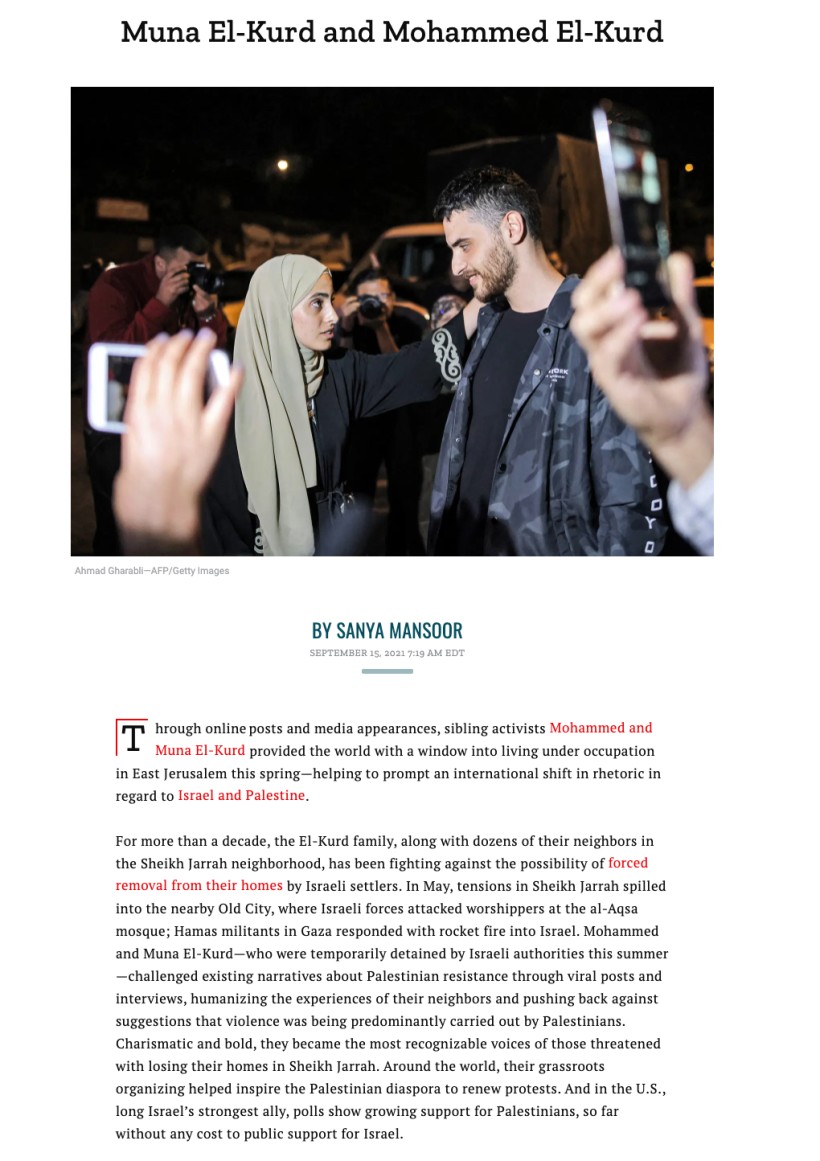 اختارت مجّلة "تايم" الأميركيّة، الشقيقين المقدسييّن محمد ومنى الكُرد، اللذين برزا خلال تغطيتهما لمحاولات التهجير المستمرّة التي يتعرّض لها حيّهما الشيخ جراح؛ ضمن قائمتها السنويّة لأكثر 100 شخصية تأثيرا على مستوى العالم، للعام 2021.وبحسب المجلّة، "أتاح الناشطان الأخوان محمد ومنى الكرد للعالم، نافذة على العيش تحت الاحتلال في القدس الشرقية... من خلال المشاركات على الإنترنت والظهور الإعلامي... ممّا ساعد على إحداث تحول دولي في الخطاب في ما يتعلق بإسرائيل وفلسطين".وذكرت المجلّة، أن عائلة الكرد، تناضل "لأكثر من عقد من الزمان، مع العشرات من جيرانهم في حي الشيخ جراح، ضدّ إمكانية إخلاء منازلهم قسريًا، من قبل المستوطنين...".وقالت إنه "في (أيار) مايو، امتدت التوترات في الشيخ جراح إلى البلدة القديمة المجاورة، حيث هاجمت القوات الإسرائيلية المصلين في المسجد الأقصى".وأوضحت أنّ الشقيقين الكرد "اللذين احتجزتهما السلطات الإسرائيلية مؤقتًا هذا الصيف، تحديا روايات حول المقاومة الفلسطينية من خلال المنشورات والمقابلات... وإضفاء الطابع الإنساني على تجارب جيرانهم" الذين يواجهون خطر التهجير من منازلهم كذلك.ولفتت المجلة إلى أن الشقيقين "يتمتعان بشخصية جذابة وجريئة، وأصبحا أكثر الأصوات شهرة لأولئك المهدَّدين بفقدان منازلهم في الشيخ جراح".وذكرت المجلة أنّه "في جميع أنحاء العالم، ساعد تنظيمهم الشعبي في إلهام الشتات الفلسطيني لتجديد الاحتجاجات. وفي الولايات المتحدة، الحليف الأقوى لإسرائيل منذ فترة طويلة، تظهر استطلاعات الرأي دعمًا متزايدًا للفلسطينيين...".بدوره، قال محمد في بيان نشره عبر تغريدة في "تويتر": "اختياري وأختي ضمن ’أكثر 100 شخصية تأثيرا في العالم’ لربما هو مؤشر إيجابي باتجاه مركزة القضية الفلسطينية في الحيز العام العالمي. لكن صناعة الرموز –التي تختزل نضال شعب بأكمله في وجه واحد- لا تكفي لمناصرة الشعب الفلسطيني".وأضاف: "ما نطالب به هو تغيير جذري وملموس للمنظومة الإعلامية التي تشمل ’تايمز’ لإنهاء انحيازها للصهيونية، ودفعها لتكون أكثر جرأة في الحديث عن الحركات التحررية والمقاومة الفلسطينية بكل أشكالها".وتابع الكرد: "إن الحقبة الجديد التي يشهدها وتشهدها الفلسطيني/ة، كانت نتاج تنظيم ونضال تراكمي لمئات الآلاف من الفلسطينيين الذين صارعوا منظومة الاستعمار لسبع عقود بدون أي شكر أو اعتراف دولي".وتواجه 28 عائلة بحي الشيخ جراح مخاطر إجلائها قسرًا من منازلها التي تقيم فيها منذ العام 1956 لصالح مستوطنين، وسط ادعاءات إسرائيلية بأن المنازل أقيمت على أرض كانت بملكية يهودية قبل عام 1948.