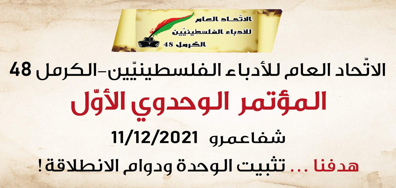 وتحت الشعار: هدفنا... تثبيت الوحدة ودوام الانطلاقة!ينتخب هيئاته ويجدّد ثقته بالكاتب سعيد نفّاع أمينًا عامّا وجهاد بلعوم نائبًا، للأربع سنوات القادمةعقد الاتّحاد العام للأدباء يوم 11 كانون الأوّل 2021 مؤتمره الوحدويّ الأوّل في مدينة شفاعمرو، بعد أن كانت أطلقت الحركة الثقافيّة في ال48 أوائل العام 2019 الوحدة في صفوفها. وقد انتخب المؤتمر هيئاته؛ الأمانة العامة، والمراقبة، والأمين العام والنائب.وكان الاتّحاد افتتح أعمال هذا اليوم بجلسة طارئة للمجلس العام للبتّ في القضايا الدستوريّة واقتراحات التعديلات. رئس المجلس الأعضاء يوسف بشارة رئيسًا للجلسة، وأسمهان خلايلة، وفوز فرنسيس، ومصطفى عبد الفتّاح، وسعيد نفّاع أعضاء رئاسة.شارك في الاقتراحات الدستوريّة الأعضاء؛ محمّد هيبي - عضو لجنة الصياغة، ومفيد صيداوي، وعليّ هيبي، مقدّمين سلّة من اقتراحات التعديل على اقتراح لجنة الصياغة. وطرح العضو أسامة مصاروة تصوّره لموقع نائب الأمين العام في الدستور والمخالف لتصوّر لجنة الصياغة. وعن الأكثريّة في لجنة الصياغة التي كانت أُقِرّت في الأمانة العامة وأَقَرّت بالغالبيّة العظمى اقتراح النظام الداخليّ الدستور، ناقش كل من؛ رئيس اللجنة مصطفى عبد الفتّاح، ومحمّد علي سعيد، وسعيد نفّاع.بعد النقاش جرت عمليّة تصويت سريّة شارك فيها 141 عضوًا من أعضاء الاتّحاد ال-186 عضوّا، وبأغلبيّة كبيرة فاقت الثلثين، رفض المؤتمر التحفّظات جميعها وتبنّى اقتراح لجنة الصياغة ليصير النظام الداخلي الدستور للاتّحاد للأربع سنوات القادمة. ومن التعديلات في اسم الاتّحاد مثلًا استبدلت: كلمة "الأدباء" ب-"الكتّاب" ليصير الاسم: "الاتّحاد العام للكتّاب الفلسطينيّين – الكرمل48". مباشرة بعد الحسم في المجلس الطارئ وإقرار النظام الداخلي الدستور، افتُتِح المجلس الانتخابيّ المؤتمر، وقد رئس المؤتمر: فتحي فوراني، بطرس دلّة، فردوس حبيب الله، جهاد عقل، فيّاض هيبي، عبد الله بدير وسامي مهنّا. حيث طرحوا جدول الأعمال معطين الحقّ لكل مرشّح للأمانة العامة (27) والمراقبة (7) أن يعرض نفسه أمام المؤتمرين، وكذا للمرشّح لموقع نائب الأمين العام جهاد بلعوم، والمرشّحين لموقع الأمين العام؛ عليّ هيبي وسعيد نفّاع.جرت بعد ذلك عمليّة تصويت سريّ في ثلاثة صناديق رئسها كلّ من؛ فيّاض هيبي، عبد القادر عرباسي وزاهر بولس، أسفرت نتائجها عن فوز جهاد بلعوم بموقع نائب الأمين العام بأكثريّة كبيرة، إذ جرى التصويت السريّ عليه رغم كونه مرشّحا وحيدًا. وأسفرت عن فوز الكاتب سعيد نفّاع بموقع الأمين العام. وفاز في عضويّة لجنة المراقبة الأخوة؛ حسن عبّادي، ياسين مصطفى بكري، عبد الخالق أسدي، أمين زيد الكيلاني، جهاد عقل، يوسف بشارة وعبد الله نمر بدير. وأمّا أعضاء الأمانة ال-26 (إذ لم يُحسم بعد الموقع 27) فهم: ميساء الصحّ، حسين ياسين، فهيم أبو ركن، عناد جابر، فتحي فوراني، جهاد بلعوم، محمّد علي سعيد، زياد شليوط، أسامة ملحم، زاهر بولس، مفلح طبعوني، نبيل طنّوس، فوز فرنسيس، علي هيبي، سامي مهنّا، فردوس حبيب الله، عبد القادر عرباسي، ناظم حسّون، سعيد نفّاع، أحمد الخطيب، أسمهان خلايلة، خالديّة أبو جبل، مصطفى عبد الفتّاح، محمّد هيبي ومفيد صيداوي. هذا ومن المقرّر أن تجتمع لجنة المراقبة ولجنة الانتخابات يوم 19.12.21 لتحسما في الموقع 27. وهذا وفي النهاية قرأ ممثّل لجنة الانتخابات الأخ زياد شليوط نتائج الانتخابات، واختتم عضو الرئاسة الأخ سامي مهنّا المؤتمر بكلمة أشاد فيه بما تحقّق في مسيرة وحدتنا والتي توجّها وثبّتها المؤتمر. اليوم 13 كانون الأوّل 2021..**التواصل: سعيد نفّاع 7208450-050
