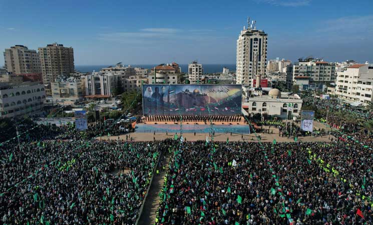 غزة.. أحيت حركة حماس ذكرى انطلاقتها الـ 35، بمهرجان جماهيري كبير أقيم في “ساحة الكتيبة”، حضرته حشود كبيرة من المواطنين، قدمت من كل مناطق قطاع غزة، وتخللها للمرة الأولى كلمة لقائد الجناح العسكري محمد الضيف، أشاد بها بالمقاومة وتوعد قادة الاحتلال.وهدد الضيف، في كلمة مسجلة، خلال عرض عسكري لأفراد من القسام خلال المهرجان، دولة الاحتلال، موجها رسالة تحذير لإسرائيل التي تستعد لتشكيل حكومة من اليمين المتطرف، قال فيها: «أيها الغرباء عن أرضنا، لقد عجز آباؤكم المؤسسون وهم في قمة جبروتهم وانتمائهم لفكرة الصهيونية الخبيثة عن استئصال شعبنا، أو طمس هويتنا»، وأضاف: “أنتم اليوم أعجز وأجبن من أن تنجحوا في ما فشل فيه آباؤكم، وستكون نهايتكم وزوال كيانكم وكنسكم عن أرضنا هي غنيمتنا ووعد ربنا الذين لن يتأخر عنكم بإذن الله”.وطالب بأن “تتوحد كل الرايات ولتلتئم كل الجبهات ولتفتح كل الساحات لهدف واحد وغاية كبيرة نبيلة مقدسة وهي تحرير فلسطين”، وأشاد الضيف، الذي لا يخرج للعلن، ولا تعرف صورته، بأهالي الشهداء والجرحى والمصابين والأسرى والمبعدين، وقال: “عهداً أن نواصل طريق الشهداء حتى نلقى الله مقبلين غير مدبرين”.وتخلل المهرجان قيام أحد أفراد الجناح العسكري لحركة حماس، عرض بندقية الضابط الإسرائيلي هدار جولدن، الذي وقع في قبضتهم، في الحرب التي شنتها إسرائيل ضد غزة في صيف العام 2014، وقال إن البندقية التي حملها هذا الناشط في القسام، والذي يعمل في “وحدة الظل” المسؤولة عن إخفاء الجنود الأسرى، تحمل الرقم (42852351).وتقول إسرائيل إنه قتل قبل أسره، فيما ترفض حماس الكشف عن مصيره، وتطلب مقابل ذلك أن تحصل على عدة مطالب.وفي الكلمة المركزية لحركة حماس، التي ألقاها في المهرجان رئيس الحركة يحيى السنوار، أكد على مضي حماس في طريق المقاومة، وتطرق في كلمته إلى صمت المقاومة في غزة على الهجمات الإسرائيلية الأخيرة ضد الضفة والقدس، وأشار إلى أنها جاءت في إطار تكتيك للحركة، يهدف إلى إعطاء غزة فترة لـ “التقاط الأنفاس”، لكنه قال إن الصمت فيه إعداد لقدرات المقاومة، وأشاد في ذات الوقت بالمقاومة في الضفة والقدس، التي تواجه الاحتلال بكل الوسائل.وأشار إلى أن عام 2023 سيكون فيه “استحقاقات وطنية كبرى”، بعد صعود اليمين الفاشي إلى الحكم، وأضاف: “نحن أمام مواجهة مفتوحة مع هذا العدو الذي يصر أن تكون المعركة دينية”، وتوعد السنوار بأن المقاومة قادرة على قلب المعادلات، مشيرا إلى أن المقاومة أسقطت من قبل حكومات عدة للاحتلال، وأضاف: “قادرون على إسقاط كل حكومات الاحتلال”.وقال، موجها حديثه لقادة اليمن الإسرائيلي: “لا نخشاكم ولا نخشى تهديداتكم ولا سياساتكم”، وأضاف: “مقاومتنا وشعبنا جرب من هو أبشع وأخطر منكم من قادتكم، وقد أسقطنا وقبرنا قادتكم سابقًا”.وأشاد بجهود الجزائر الرامية لإتمام المصالحة، بهدف إنهاء الانقسام، وإعادة ترتيب منظمة التحرير، لكنه جدد رفض حماس لشروط الموافقة على شروط اللجنة الرباعية من أجل تشكيل حكومة وحدة وطنية.وقال إن حماس لم تختلف يوما مع حركة فتح “حينما كانت ترفع لواء الكفاح المسلح”، وأن حماس على وفاق كامل وتنسيق مع كل من يحمل البندقية، وانتقد في ذات الوقت حملة الاعتقالات الأخيرة في الضفة الغربية التي طالت نشطاء حماس، وقال إنها تعد “مؤشراً على أن قيادة التنسيق الأمني مصرة على السير في النفق المظلم”، ودعا قيادة السلطة إلى تنفيذ قرارات المجلس المركزي و”وقف التنسيق الأمني”.وحين تطرق لملف الأسرى، أعلن في ظل تعنت الاحتلال، ورفض مطالب حماس، عن مهلة لم يحددها بعد، للتجاوب مع مطالب المقاومة لإنجاز صفقة تبادل الأسرى، وهدد في حال عدم تجاوب الاحتلال بإغلاق هذا الملف، والبحث عن طرق أخرى لتحرير الأسرى، لافتا إلى أن آخر وساطة بشأن إتمام الصفقة كانت قبل انتخابات دولة الاحتلال الأخيرة، وتوقفت بعد هذه الانتخابات.وأطلقت حركة حماس شعار “قادمون بطوفان هادر” على هذا المهرجان، الذي شهد حشدا جماهي