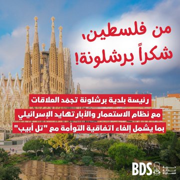 أعلنت رئيسة بلدية برشلونة الإسبانية، اليوم الأربعاء، تجميد العلاقات مع مدينة تل أبيب وإلغاء اتفاقية التوأمة معها، وذلك بسبب نظام الفصل العنصري (الأبارتهايد) الذي تمارسة إسرائيل بحق الفلسطينيين.وقالت أدا كولاو، عمدة المدينة اليسارية، خلال مؤتمر صحافي، “طالب أكثر من مئة منظمة وأكثر من 4 آلاف مواطن بالدفاع عن حقوق الإنسان الفلسطيني، ولهذا السبب، بصفتي رئيس البلدية، كتبت إلى رئيس الوزراء الإسرائيلي بنيامين نتنياهو لأبلغه بأنني علقت مؤقتا العلاقة المؤسسية بين برشلونة وتل أبيب”.وحيت حركة مقاطعة إسرائيل وسحب الاستثمارات (BDS)، في بيان، المسؤولة الإسبانية والمجموعات الشعبية، التي ساعدت في الوصول لقرار تجميد العلاقات مع نظام الأبارتهايد الإسرائيلي وإلغاء اتفاقية التوأمة مع تل أبيب، مشيرة إلى أنه “بذلك تكون بلدية برشلونة أول بلدية تقطع علاقاتها مع نظام الأبارتهايد الإسرائيلي”.وأضافت “مع تصاعد جرائم الحكومة الإسرائيلية ذات النزعة الفاشية بحق شعبنا في الأشهر الأخيرة، بدأ العالم يلتفت أكثر من أي وقت مضى لبشاعة النظام الذي يقاومه الشعب الفلسطيني منذ عقود”.ودعت الحركة “جميع الحكومات ومجالس البلديات والمؤسسات حول العالم للسير على خطى بلدية برشلونة لفرض عزلة عالمية على نظام الاستعمار والأبارتهايد الإسرائيلي ومحاسبته على مجازره المستمرة والضغط على الأمم المتحدة للتحقيق في اقترافه جريمة الأبارتهايد”.