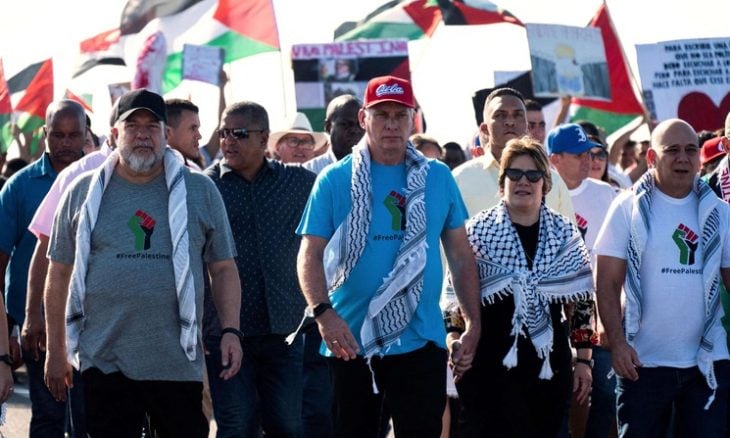 هافانا: قاد الرئيس الكوبي ميغيل دياز كانيل، الخميس، تظاهرة ضخمة في هافانا تضامناً مع الشعب الفلسطيني وجهت خلالها انتقادات للولايات المتحدة بسبب دعمها إسرائيل.وقالت كريستينا دياز (22 عاما) الطالبة في جامعة هافانا لوكالة فرانس برس “ما يطلبه الشباب الكوبي في هذه المسيرة هو وقف إطلاق النار” مضيفة “من السذاجة الاعتقاد بأن (ما يحدث في غزة) هو حرب. إنها إبادة جماعية“.وتولى الرئيس الكوبي محاطا بزوجته ليز كويستا ورئيس الوزراء مانويل ماريرو قيادة التظاهرة التي انطلقت بدعوة من الشباب الشيوعي وجرت في ماليكون، الخط الساحلي في هافانا حيث تقع السفارة الأمريكية.وقال خافيير إرنستو بوروتو (19 عاما) الذي وضع كوفية باللونين الأبيض والأسود “ما يحدث في فلسطين ظلم كبير ومذبحة”.وخلال ساعة تقريبا لوح المتظاهرون بأعلام فلسطين وبلافتات كتب عليها “فلسطين حرة” و”لا للإبادة الجماعية. تحيا فلسطين”.وشارك في هذا التجمع “أكثر من 100 ألف شخص من سكان هافانا” حسب إحصاء لوزارة الداخلية نشر على منصة إكس.ودعي الطلاب وموظفو الشركات العامة إلى المشاركة في هذه المسيرة التي نظمت خلال زيارة يجريها للعاصمة الممثل الخاص للاتحاد الأوروبي لحقوق الإنسان إيمون غيلمور.ولدى مرورهم أمام سفارة الولايات المتحدة التي تدعم حكومتها إسرائيل بقوة هتف المتظاهرون الشباب خصوصا “الفاشيون الأمريكيون أنتم إرهابيون”.!!