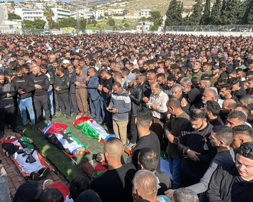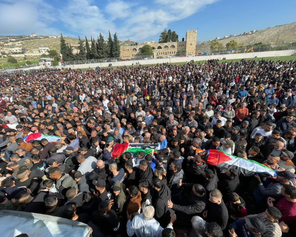 شيعت جماهير غفيرة في محافظة طوباس والأغوار الشمالية، اليوم الجمعة، جثامين الشهداء الستة الذين ارتقوا صباحا، خلال عدوان قوات الاحتلال الإسرائيلي على مخيم الفارعة.وانطلق موكب التشييع من المستشفى التركي الحكومي في طوباس، وصولا إلى مخيم الفارعة، حيث تم إلقاء نظرة الوداع الأخيرة على الشهداء.وردد المشاركون في التشييع الهتافات المنددة بجريمة الاحتلال في المخيم وبعدوان الاحتلال على شعبنا في قطاع غزة والضفة الغربية، وسط حزن عم المحافظة، ومن ثم أدوا صلاة الجنازة على الشهداء في ملعب صلاح خلف عند المدخل الشمالي للمخيم، قبل مواراة جثامينهم الثرى في مقبرة المخيم.وكانت قوات إسرائيلية خاصة "مستعربون" قد تسللت إلى المخيم في وقت سابق من صباح اليوم، ولاحقا دفعت قوات الاحتلال بتعزيزات عسكرية إليه، فيما اعتلى القناصة أسطح عدد من البنايات، ما أدى لاندلاع مواجهات، أسفرت عن استشهاد ستة مواطنين، بينهم طفل، هم: ماهر عبد الله أحمد جوابرة (14 عاما)، وعمر باسم محمود صبح (23 عاما)، وعماد نهاد خالد جوابرة (18 عاما)، وقاسم محمد مصطفى دراغمة (33 عاما)، وثائر عبد الله شاهين (36 عاما)، وبراء موسى الأمير (30 عاما)، فيما ذكرت جمعية الهلال الأحمر الفلسطيني أن طواقمها تعاملت مع 6 شهداء في المخيم، و6 إصابات بالرصاص الحي، وصفت إحداها بالخطيرة للغاية.!!