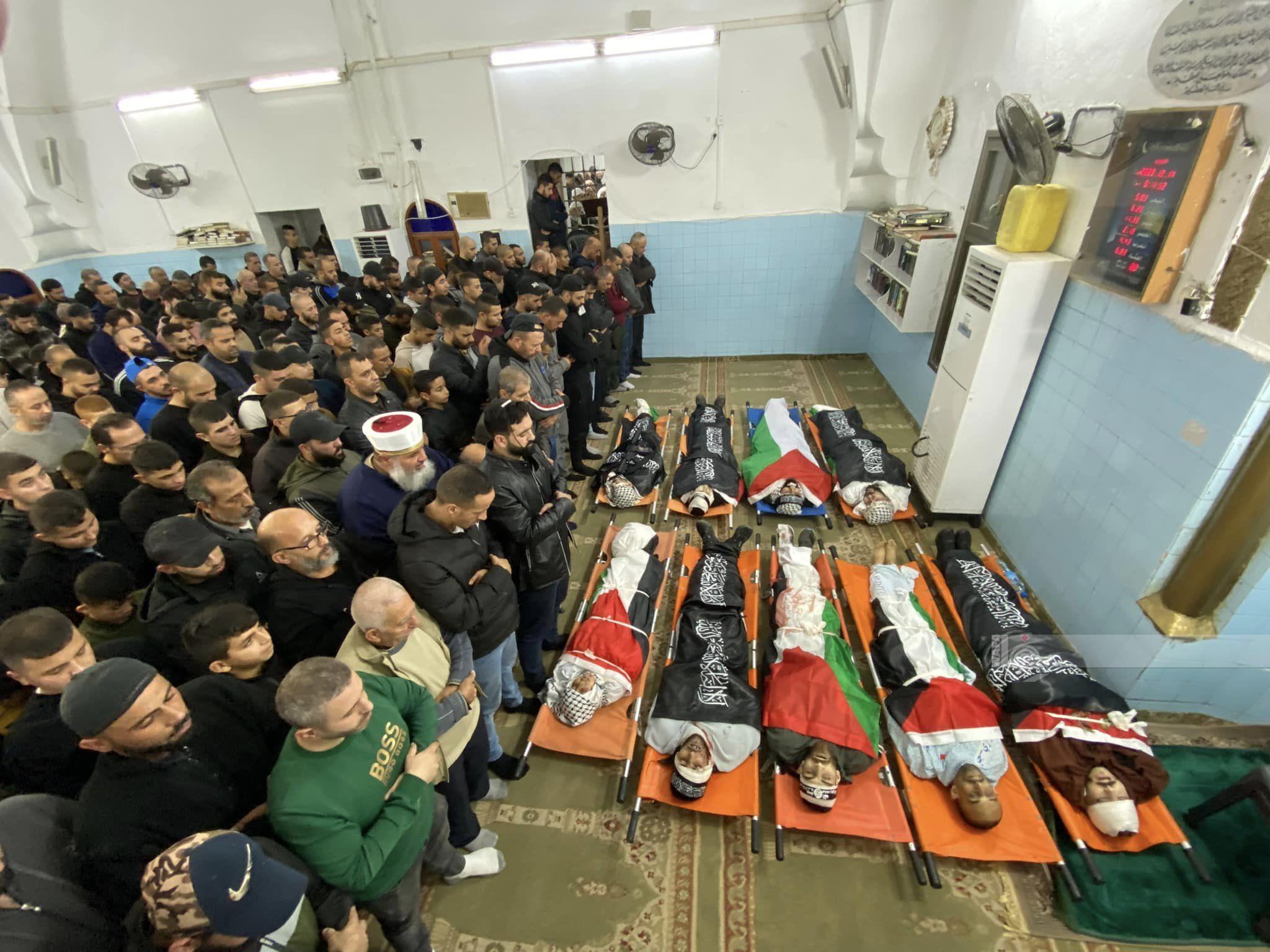 شيّعت جماهير غفيرة من أبناء شعبنا في محافظة جنين، مساء الخميس، جثامين شهداء مجزرة جنين الـ11، الذين ارتقوا إثر استهدافهم بالطائرات المسيرة والرصاص، خلال العدوان الإسرائيلي على جنين ومخيمها الذي استمر لمدة ثلاثة أيام.والشهداء هم: أيوب محمد صالح جلامنة (27 عاما)، ورشاد محمد تركمان (18 عاما)، وفؤاد عماد عباهرة (36 عاما)، وأحمد جمال أبو زينة (27 عاما)، والطفل بشار هيثم أبو زيد (10 أعوام)، ورشاد محمد تركمان (18عاما)، وقسام باسم زيدان (29 عاما)، ورفيق محمد إزقيلي، ومحمود صالح أبو سرور(33 عاما)، وبكر صديق زكارنة، وثائر شادي أبو التين.وانطلقت مراسم تشييع الشهداء من أمام مستشفى جنين الحكومي، بجنازة شارك فيها آلاف المواطنين، حيث رفعت جثامين الشهداء على الأكتاف، وجاب المشيعون شوارع المدينة، وصولا إلى منازل عائلاتهم، قبل الصلاة عليهم في مسجد جنين الكبير، ومواراتهم الثرى في مقبرة الشهداء في الحي الشرقي.وردد المشاركون في التشييع الهتافات المنددة بجرائم الاحتلال والمجازر التي يرتكبها في قطاع غزة والضفة الغربية، وأخرى تدعو إلى الوحدة الوطنية.كما طالبوا المجتمع الدولي بالتدخل والوقوف إلى جانب شعبنا الذي يتعرض لعدوان إسرائيلي وجرائم حرب وإبادة.وألقيت كلمات نددت بجرائم الاحتلال وعدوانه المستمر على أبناء جنين ومخيمها وقرى وبلدات المحافظة، وأكدت أن هذه المجازر لن تثني شعبنا عن المقاومة والتصدي للاحتلال والمستعمرين.وكان جيش الاحتلال قد اقتحم مدينة جنين ومخيمها يوم الثلاثاء الماضي واستمر عدوانه لثلاثة أيام، أسفر عن استشهاد 12 مواطنا بينهم طفلان، وإصابة ما يزيد عن 10 مواطنين بالرصاص الحي.كما دمرت قوات الاحتلال خلال العدوان، البنية التحتية من شوارع ومياه وكهرباء وشبكات الصرف الصحي، وصرح الشهداء، وقصفت بالطائرات المسيرة وبصواريخ الأنيرجا ما يزيد عن 10 منازل، ما أدى إلى تدميرها بالكامل، كذلك قصفت محلات تجارية وصالون حلاقة وحرقت ودمرت بسطات الخضار والفواكه ومركبات المواطنين، واستولت على عدد منها.ودنست قوات الاحتلال حرمة مسجد في مخيم جنين بعد اقتحامه، وإقامة طقوس تلمودية عبر استخدام مكبرات الصوت فيه، وأدت الأغاني العبرية والرقص داخله، في مخالفة للأعراف الدولية.