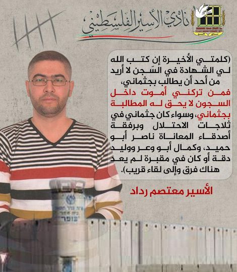 القدس المحتلة: حمّلت منظمة حقوقية فلسطينية، الإثنين، إسرائيل المسؤولية عن حياة أسير يعاني أوضاعا “خطيرة”، محذرة من ارتكابها “جريمة طبية” بحقه.جاء ذلك في بيان لجمعية نادي الأسير الفلسطيني (غير حكومية)، نقلت فيه نصا للأسير ينعى نفسه.وأضافت أنها تحمّل “الاحتلال المسؤولية الكاملة عن مصير الأسير المريض معتصم رداد (42 عامًا) من بلدة صيدا/ طولكرم (شمال)، والذي يتعرض لجريمة طبيّة ممنهجة ومتواصلة”.وذكرت أن رداد “معتقل منذ عام 2006، ومحكوم بالسجن 20 عامًا، وتعرض خلال عملية اعتقاله لإصابات بعشرات الشظايا، ولاحقاً واجه ظروفاً اعتقالية قاسية ساهمت في تفاقم وضعه الصحي، وإصابته بأمراض مزمنة وخطيرة”.وقالت إن رداد محتجز في سجن عوفر غربي رام الله “داخل زنزانة لا تتوفر فيها أدنى شروط الحياة الآدمية”.واستنادا إلى زيارات سابقة جرت له وشهادات أسرى أفرج عنهم، وصفت الجمعية الظروف الصحيّة للأسير بأنها “من أصعب الحالات المرضية في سجون الاحتلال الإسرائيلي”.ونقلت الجمعية رسالة من الأسير رداد قال فيها: “أشعر بداخلي أنني الشهيد القادم داخل سجون الاحتلال، فوضعي يتدهور يوميًا وخلال الأشهر الماضية أصبتُ بحالات إغماء متواصلة، والأمعاء تنزف يوميًا”.وأضاف: “معاناتنا كمرضى في السجون لا يمكن تصورها بأي شكل من الأشكال. نحن نموت يوميًا فنحن محتجزون في زنازين ومحاصرون بالجوع والعطش والقمع والتنكيل والتعذيب ومحرومون من أدنى شروط الرعاية الصحيّة”.وتابع رداد: “كلمتي الأخيرة إن كتب الله لي الشهادة في السّجن أنني لا أريد من أحد أن يطالب بجثماني، فمن تركني أموت داخل السجون لا يحق له المطالبة بجثماني”.من جانبها، أفادت هيئة شؤون الأسرى والمحررين (حكومية) بأن الأسيرات الفلسطينيات داخل “سجن الدامون” الإسرائيلي “يعشن حالة من العزلة والتفرد”.وأضافت الهيئة، في بيان وصل الأناضول، أن إدارة السجون الإسرائيلية تمارس بحق المعتقلات “كافة أشكال التعذيب والتنكيل”.وذكرت، استنادا إلى زيارات محاميها لبعض الأسيرات، أنهن “يواجهن نقصا حادا في الاحتياجات النسائية، وغيرها من ضروريات الحياة التي تصل إلى حد الحرمان وذلك للتأثير على نفسياتهن، وتحطيم حالتهن الإنسانية والوطنية”.وقالت إن “الوضع العام لجميع الأسرى والأسيرات صعب ومقلق للغاية” وجددت نداءها “لكافة المؤسسات والمنظمات الدولية من أجل إنقاذ الأسرى وعدم تركهم فريسة للإجراءات الانتقامية”.كما أفادت الهيئة في بيان منفصل، أن قائد الجيش الإسرائيلي في الضفة الغربية (لم تسمه) أصدر قرارا “بتجديد الأمر العسكري القاضي بإدارة جلسات المحاكم العسكرية عبر تقنية الفيديو كونفرنس، أي عبر الشاشات دون إحضار الأسرى من شتى السجون إلى قاعات المحاكم” وذلك حتى 1 يوليو/ تموز المقبل.يشار إلى أنّ حصيلة الاعتقالات بعد الحرب على غزة في السابع من أكتوبر/ تشرين الأول الماضي، بلغت نحو 8725، وفق مؤسسات مختصة بشؤون الأسرى.وبموازاة حربه على غزة، صعّد الجيش الإسرائيلي ومستوطنون اعتداءاتهم على الفلسطينيين وممتلكاتهم بالضفة، بما فيها القدس، ما أدى إلى استشهاد 498 فلسطينيا وإصابة نحو 5 آلاف وفق مصادر رسمية فلسطينية.ومنذ 7 أكتوبر الماضي، تشن إسرائيل حربا مدمرة على غزة خلفت عشرات الآلاف من الشهداء والجرحى، معظمهم أطفال ونساء، ودمارا هائلا، ومجاعة أودت بحياة أطفال ومسنين، حسب بيانات فلسطينية وأممية.!!