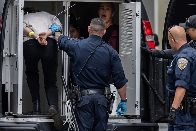 سان فرانسيسكو : اعتقلت الشرطة الأمريكية العديد من المتظاهرين المتضامنين مع فلسطين في مبنى “القنصلية الإسرائيلية” في مدينة سان فرانسيسكو بعد أن احتل العشرات منهم ردهة المبنى احتجاجاً على الحرب الإسرائيلية الدامية على قطاع غزة.وقالت الشرطة في وقت متأخر من صباح الإثنين إنها بدأت في اعتقال المتظاهرين . ويوجد حوالي 70 متظاهرًا داخل الطابق الأول من المبنى.وحمل المتظاهرون لافتات كتب عليها ” الصهيونية تقتل” و” ارتكاب إبادة جماعية يجعل اليهود أقل أمانا”.وظهر متظاهرون في مقاطع فيديو وهم يهتفون “عاشت الانتفاضة”. وأصدرت شرطة سان فرانسيسكو بيانًا قصيرًا قالت فيه: “وصل الضباط إلى مكان الحادث ويتعاملون حاليًا مع الاحتجاج والمتجاوزين المحتملين الذين لهم صلة بالاحتجاج”.وتقع القنصلية في 456 شارع مونتغمري رقم 2100، في الحي المالي بالمدينة.!!