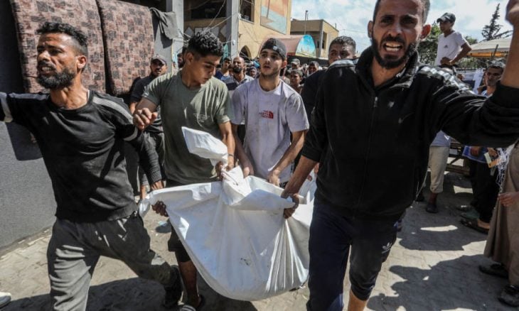 غزة ـ كتب حنين حمدونة ومحمد عيسى: استهدف جيش الاحتلال الإسرائيلي صباح الخميس، مدرسة “رفيدة” وسط مدينة دير البلح جنوبي غزة، بصاروخ من طائرة طراز أف 16 أثناء تجمع نازحين للحصول على طعام التكية الذي يقدم لهم كمعونات، الأمر الذي أدى الى استشهاد 28 بينهم نساء وأطفال.وعلى باب ثلاجة الموتى في مستشفى شهداء الأقصى كان جثمان شهيد ممدا على الأرض وأمه بجانبه تصرخ. وتقول للمتجمعين: “لا تبكوا ابني بخير”.وعلى الناحية الأخرى، اصطفت عشر فتيات يصرخن ويبكين، كانت أصواتهن تتعارض مع بعضهن البعض. إحداهن قالت: “ربنا لا تحملنا ما لا طاقة لنا به”، وأخرى تقول “أبوي صلى صلاة الشكر، يا رب أخوي الوحيد، أبوي تعب لما جابه وتعب لما رباه، لا حول ولا قوة إلا بالله”. أما الأب الذي صلى صلاة شكر واحتساب لاستشهاد نجله الوحيد جاء صامتاً احتبس الدمع في عينيه، وحاول تهدئة روع بناته، ونظر إلى زوجته وابنه بحزن وحسرة.وقال عبد السلام مصباح قاسم والد الشهيد لـ ” القدس العربي”: “ما حدث فظاعة كبيرة، فقد كان فريق المدرسة يحضر لتقديم طعام التكية للنازحين، وتم استهداف غرفة الإدارة بصاروخ مباغت. سقط الصاروخ مخترقاً الطابق الثاني والطابق الأول، وأنا فقدت ابني الوحيد الذي أنجبته على عشر بنات، وهو أب لأربعة أطفال وعمره لا يتجاوز 27 سنة، هو شاب وأطفاله صغار حرم من الحياة وأبناؤه حرموا من والدهم بسبب جريمة الاحتلال فقد استهدفوا مركز إيواء نازحين من دون تحذير، ولا نقول الا ما يرضي الله إنا لله وإنا إليه لراجعون وحسبي الله ونعم الوكيل”.وفي ناحية أخرى سيدة تجلس على الأرض تبكي على زوجها برفقة ابنها الكبير، وتلح على توديعه، وتارة أخرى تقول “لا أحد يخبر أبنائي لا تقولوا لهم بأن أباهم قد مات وتركني وأنا لا أعلم كيف سأربيهم”، ومن ثم تصرخ وتقول “دغري موتوه ما يمكن فيه الروح، يمكن عايش بس انتوا مش عارفين”، ومن ثم تصرخ من جديد “دعوني أودعه أريد أن أراه هذه أخر مرة سأشاهده لآخر مره أريد أن أراه وجسده ما يزال ساخناً”، وبينما آخرون يمنعونها من الذهاب إليه فإن أحد أقربائه يصر على أن تحافظ على الصورة المرسومة له في ذاكرتها، ويخبرها بذلك مباشرة ويقول لها “يا أختي اصبري واحتسبي لم يتبق من زوجك سوى رأسه حافظي على ما تذكرينه منه ولا تودعيه”.