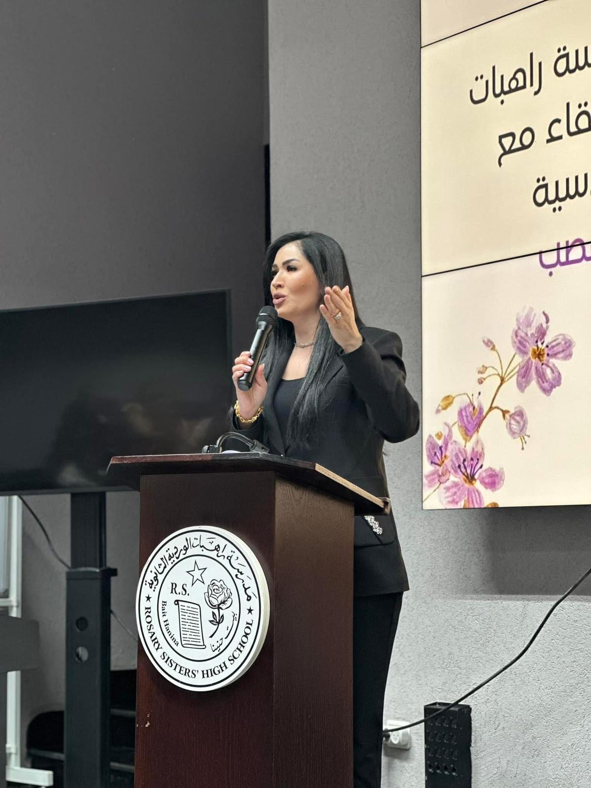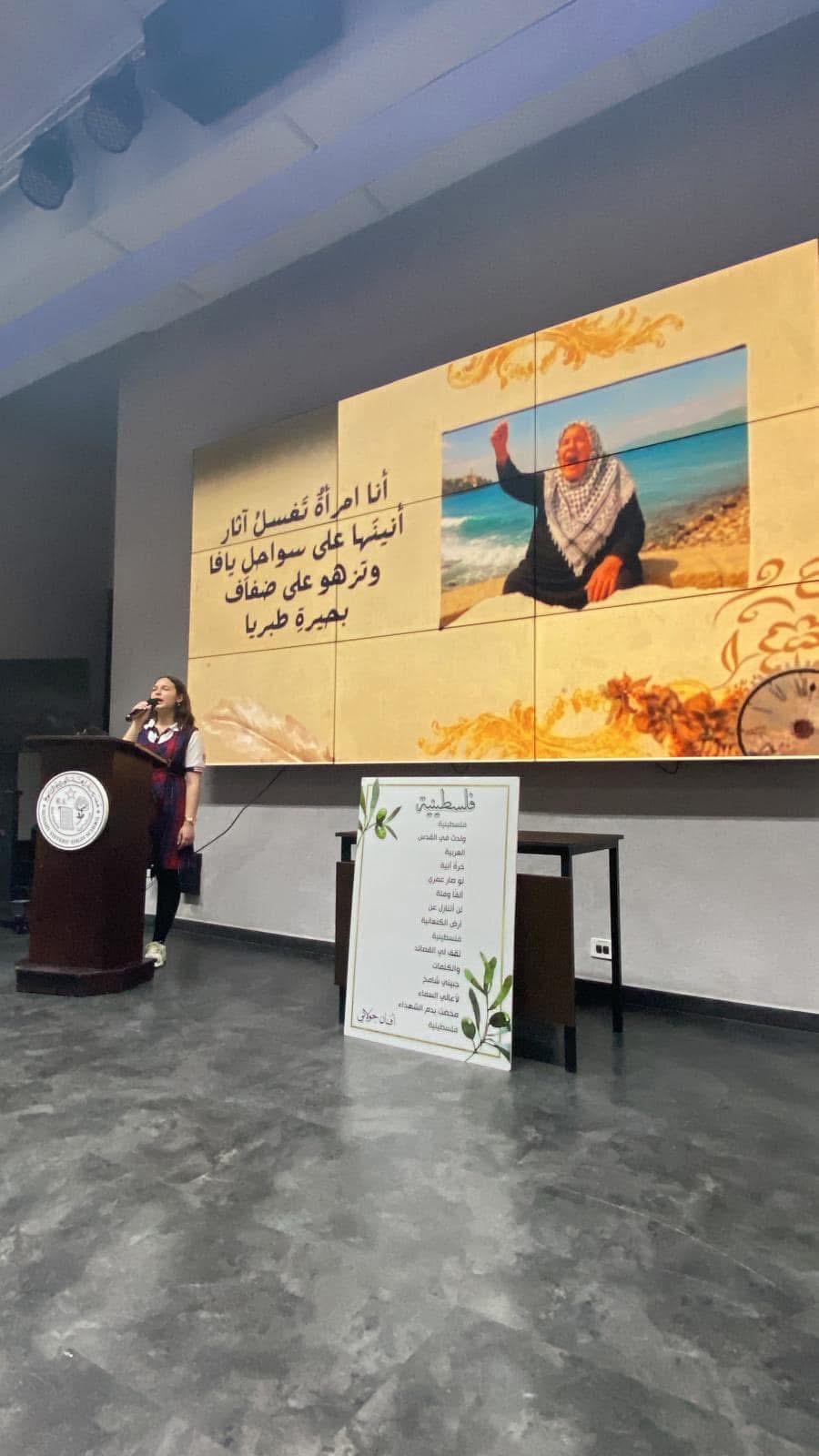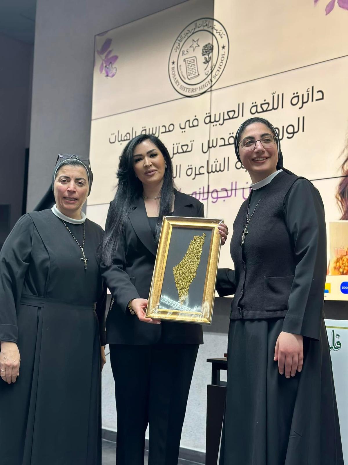 نظّمت مدرسة راهبات الوردية في القدس، يوما أدبيا تكريميا احتفاءً بالأديبة الشاعرة المقدسية أفنان جولاني، ضمن فعاليات ثقافية تمحورت حول أعمالها الأدبية والشعرية، بمشاركة طالبات ومعلمات المرحلة الثانوية.واستُهلت الفعاليات باستقبال الأديبة من قبل إدارة المدرسة وكادر اللغة العربية، حيث عُرضت جدارية ولوحات تعبيرية أعدتها طالبات الصف الحادي عشر، مستوحاة من روايتها الأخيرة "عبق الأرض" ومؤلفاتها الأخرى. وألقت المعلمة ناريمان أبو فرحة كلمة ترحيبية بالضيفة، سلطت فيها الضوء على مسيرتها الأدبية الإبداعية، تلاها عزف النشيد الرسمي للرابطة العالمية للدفاع عن اللغة العربية. وأشادت مديرة المدرسة، الأستاذة لوسي جاد الله، بإسهامات الأديبة الجولاني في الساحة الأدبية، وبما تقدّمه من أعمال تحمل رسائل وطنية وإنسانية عميقة، مؤكدة اعتزاز المدرسة باستضافتها. وقدمت لها درعا تكريميا تقديرا لمسيرتها الأدبية. ووصفت جاد الله المناسبة بأنها احتفاء بالقدس وهويتها الثقافية من خلال تكريم صوت أدبي نسوي مشرف. وقدمت للأديبة درعا تكريميا تقديرا لمسيرتها الأدبية. وبدورها، أثنت الأديبة الجولاني على الجهد الذي تبذله مديرة المدرسة الأستاذة لوسي، ووصفتها بأنها قيادية تربوية ملهِمة، تمتلك رؤية ثقافية وإنسانية، وتحرص على ترسيخ القيم الجمالية والفكرية في نفوس الطالبات. وعبّرت عن امتنانها العميق للمدرسة، ومعلماتها، وطالباتها، مشيدة بالمستوى الثقافي والفني والإبداعي للفعاليات، لافتة إلى أن توجيهات المديرة ساهمت في إحداث نقلة نوعية في مسيرة المدرسة من خلال النهوض بمستوى التعليم، وتعزيز روح العمل الجماعي بين الهيئة التدريسية والطالبات، مما نتج عنه بيئة تعليمية مزدهرة ومشجعة على الابتكار والإبداع. واضافت الجولاني أن الأستاذة جاد الله تشكل قدوة في الإلهام والعطاء، لما تتمتع به من رؤية ثاقبة ورعاية شاملة، مشيرة إلى أن المدرسة، بقيادتها، استطاعت تجاوز العديد من التحديات وحققت نجاحات ملموسة، محولة إياها إلى فضاءٍ تربوي نابض بالإبداع، وملاذٍ آمن لطالباتها، يسعين على تحقيق أحلامهن والوصول إلى أعلى المراتب وكما شكرت المدرسة والمعلمة ناريمان أبو فرحة، لمبادرتها وإشرافها الكامل والدقيق على تنظيم الفعالية، وما بذلته من جهد كبير في إخراج هذا اليوم الثقافي بأعلى درجات التميز. وتضمنت الفعالية إلقاء الجولاني قصيدتين من شعرها، ومشاركتها في حوار مفتوح مع الطالبات حول تجربتها في الكتابة، كما أهدت المدرسة لوحة فنية تتضمن مقطعا من قصيدتها "فلسطينية".وقدمت الطالبات مجموعة من المشاركات الأدبية والفنية التي عكست تفاعلهن مع أعمال الأديبة الجولاني، حيث أُلقيت كلمات وقصائد مقتبسة من كتاباتها تناولت موضوعات الوطن، الهوية، والإنسان. كما قدمت عروض مرئية ضمت مشاهد من القدس، ووصلات غنائية مستوحاة من قصائدها، إضافة إلى مشاهد تمثيلية مستلهمة من رواية "عبق الأرض"، وعروض أعمال فنية صممتها الطالبات بأنفسهن حملت اقتباسات ملهمة من نصوص الجولاني، عبرت عن تقديرهن لمسيرتها الأدبية ووقعها الإنساني والثقافي. ووزعت الطالبات على الحضور مطويات تعريفية من تصميمهن، تضمنت نبذة عن حياة الكاتبة وأبرز أعمالها، مثل روايتي "عبق الأرض" و"كان لي"، وديوان "رفيق الروح"، إلى جانب مقتطفات من قصائدها.كما قدمت الخريجة أسيل أبو الهوى لوحة فنية تجسد شخصية الكاتبة، فيما وزعت الطالبات عملا فنياً من الورود الزرقاء يحمل بطاقات مقتبسة من أقوال ملهمة في كتابات الجولاني. وقدّم الأستاذ عيسى بنورة خاطرة شعرية نظمها خصيصاً بالمناسبة، عبّر فيها عن تقديره لمسيرة الجولاني الأدبية. ويُذكر أن الكاتبة أفنان الجولاني هي أديبة وشاعرة من مدينة القدس، تحمل في أعمالها هما وطنيا وإنسانيا، وتركز كتاباتها على قضايا الهوية الفلسطينية. ومثلت دولة فلسطين في عدد من المحافل الأدبية والثقافية العربية والدولية، وتم تصنيفها ضمن قائمة أفضل 100 شخصية متم