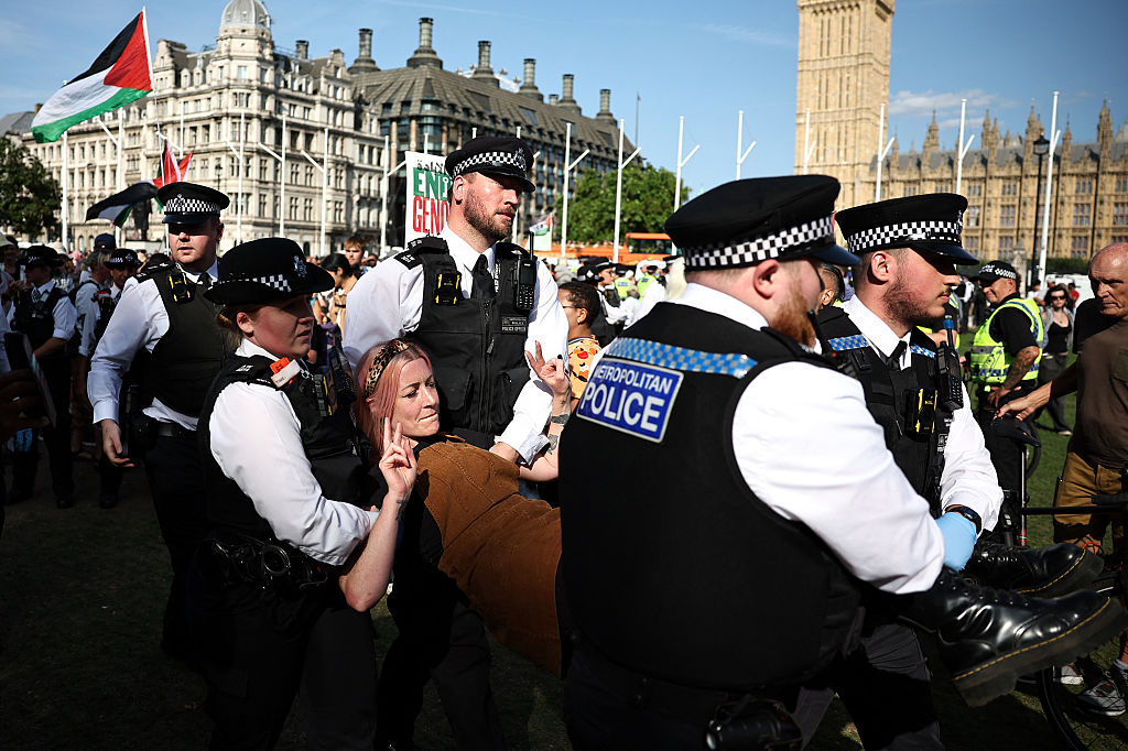 أوقفت شرطة العاصمة البريطانية السبت ما لا يقل عن 200 شخص خلال أكبر تظاهرة مؤيدة لمجموعة "العمل من أجل فلسطين – Palestine Action"، التي حظرتها الحكومة الشهر الماضي بموجب قوانين مكافحة الإرهاب.وقالت الشرطة إنها تتوقع توقيف مزيد من المتظاهرين في ساحة البرلمان، في حين قال المنظمون إن الموقوفون ليسوا سوى "جزء بسيط" من المئات الذين انضموا للتظاهرة.لكن الشرطة اعتبرت أن عددا كبيرا من المتواجدين في الساحة من المتفرجين ولم يشاركوا في التظاهرة، مؤكدة أنها ستوقف "كل من يرفع لافتة تعبر عن التأييد لمنظمة فلسطين أكشن".ونظّمت مجموعة "دافعوا عن هيئات المحلفين" (دفيند أور جوريز) هذه الفعالية، في إطار تصعيد حملتها تحت شعار "ارفعوا الحظر" التي تهدف إلى إلغاء قرار الحكومة حظر "العمل من أجل فلسطين".واتهمت المجموعة في بيان الشرطة بالتدخل في مساعيها لتنظيم تحرك معارض للحظر، مشيرة إلى أن شركة استضافة مواقع إلكترونية حجبت موقعها في بحر الأسبوع.وأضافت المجموعة التي نظمت كذلك سلسلة تظاهرات سابقة ضد الحظر، أن "أعدادا لا مثيل لها" جاءت للمشاركة في الاحتجاج، وأنهم جازفوا بالمشاركة رغم احتمال "توقيفهم وربما سجنهم" من أجل "الدفاع عن الحريات العريقة في هذا البلد".وقالت في بيانها "سنواصل تحركنا. أعدادنا تتزايد بالفعل استعدادا لموجة جديدة من الفعاليات في أيلول/سبتمبر المقبل".وتجمّع المحتجون قرب مبنى البرلمان منذ الظهيرة، حاملين لافتات كتب عليها "عارضوا الإبادة، ادعموا مجموعة فلسطين أكشن"، إلى جانب شعارات أخرى، بينما لوّحوا بالأعلام الفلسطينية.وكان من بين المشاركين كريغ بيل، اختصاصي العلاج النفسي البالغ 39 عاما والذي رفع لافتة مؤيدة للمجموعة.ووصف بيل قرار الحظر بأنه "سخيف تماما"، وقال "عندما تقارن مجموعة ’فلسطين أكشن’ بجماعة إرهابية حقيقية تقتل المدنيين وتسفك الأرواح، يبدو الأمر أشبه بنكتة أن يتم تصنيفها منظمة إرهابية".وفيما تقدم عناصر الشرطة لتوقيف المتظاهرين، صرخ بعض المشاركين في وجههم "عار عليكم"، وراحوا يصفقون للموقوفين.وقال ريتشارد بول البالغ 42 عاما والذي جاء على كرسيه المتحرك "دعهم يعتقلوننا جميعا. هذه الحكومة تجاوزت الحدود، ليس هناك ما يشعرني بالخجل مما أفعل".منذ إعلان الحكومة حظر "العمل من أجل فلسطين" في 5 تموز/يوليو، نفّذت شرطة العاصمة وقوات أمنية أخرى في المملكة المتحدة عشرات التوقيفات المشابهة خلال عطل نهاية الأسبوع.وبموجب قوانين مكافحة الإرهاب البريطانية، فإن أي شخص يُعبّر عن دعمه لمنظمة محظورة يُعرّض نفسه لخطر الاعتقال.وأعلنت الشرطة هذا الأسبوع توجيه أولى التهم لثلاثة أشخاص في إنجلترا وويلز، على خلفية تأييدهم للمجموعة خلال تظاهرة نُظّمت في 5 تموز/يوليو.وجاء قرار حظر "العمل من أجل فلسطين" بعد أن اقتحم عدد من نشطائها قاعدة جوية في جنوب إنجلترا، متسببين بأضرار قُدّرت بنحو 7 ملايين جنيه إسترليني (9,3 ملايين دولار) لقيامهم برش طائرتين عسكريتين بطلاء أحمر.وأشارت وزارة الداخلية، قبل احتجاجات السبت، إلى أن أعضاء في المجموعة يُشتبه أيضا بضلوعهم في "هجمات خطيرة" أخرى شملت "أعمال عنف، وإصابات بالغة، وأضرار جنائية جسيمة".انتقدت منظمات غير حكومية، بينها العفو الدولية وغرينبيس، قرار الحظر بشدة، واعتبرته تجاوزا قانونيا وتهديدا لحرية التعبير.ووجّه الرئيس التنفيذي لمنظمة العفو الدولية في المملكة المتحدة ساشا ديشموك رسالة إلى قائد شرطة لندن مارك رولي هذا الأسبوع، دعا فيها إلى ضبط النفس في التعامل مع من يحملون لافتات مؤيدة للمجموعة.وأكدت المنظمة أن هذه التوقيفات تُعد انتهاكا للقانون الدولي لحقوق الإنسان.ومن المقرر أن تنظر محكمة بريطانية في وقت لاحق من هذا العام في الطعن القانوني المقدّم ضد قرار تصنيف "العمل من أجل فلسطين" منظمة إرهابية.!!