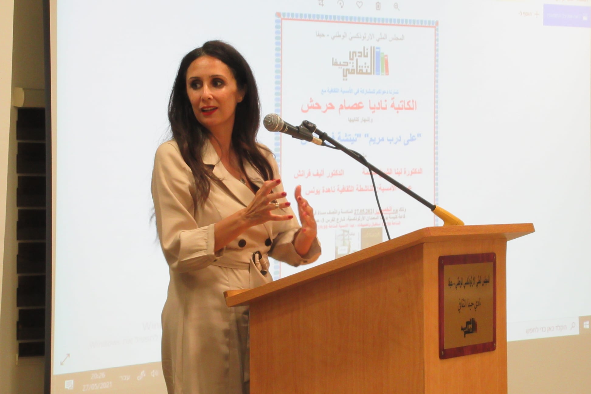 استضاف نادي حيفا الثقافي يوم الخميس 27.05.2021 الكاتبة نادية عصام حرحش ابنة مدينة القدس، في أمسية ثقافية لإشهار روايتيها الصادرتين مؤخرا: "نيتشه في القدس" - مذكرات كلب، و رواية " على درب مريم" عن دار الشام للإنتاج الثقافي وجسور ثقافية للنشر والتوزيع-عمان ودار الرعاة للدراسات والنشر .