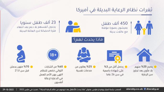 نحو نصف مليون طفل أميركي يخضعون لنظام الرعاية البديلة والذي يقوم على انتزاعهم من عائلاتهم بسبب مشاكل متنوعة، ليتم نقلهم إلى بيئة جديدة تخلصهم من معاناتهم، لكن إخفاقاً في التطبيق بسبب ثغرات الرقابة يدمر مستقبلهم.